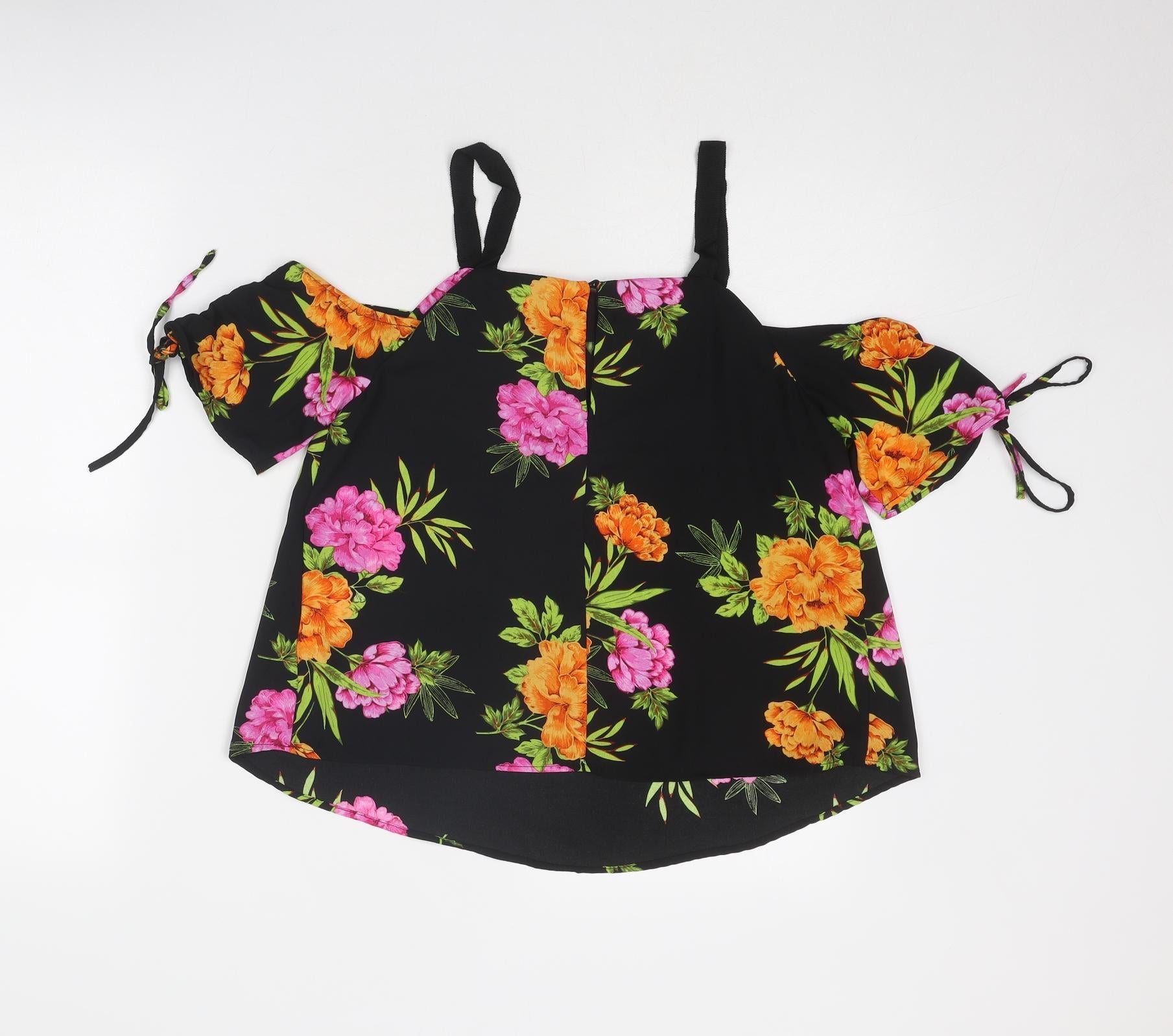 Womens Black Floral Polyester Basic Blouse Size 8 Round Neck - Cold Shoulder