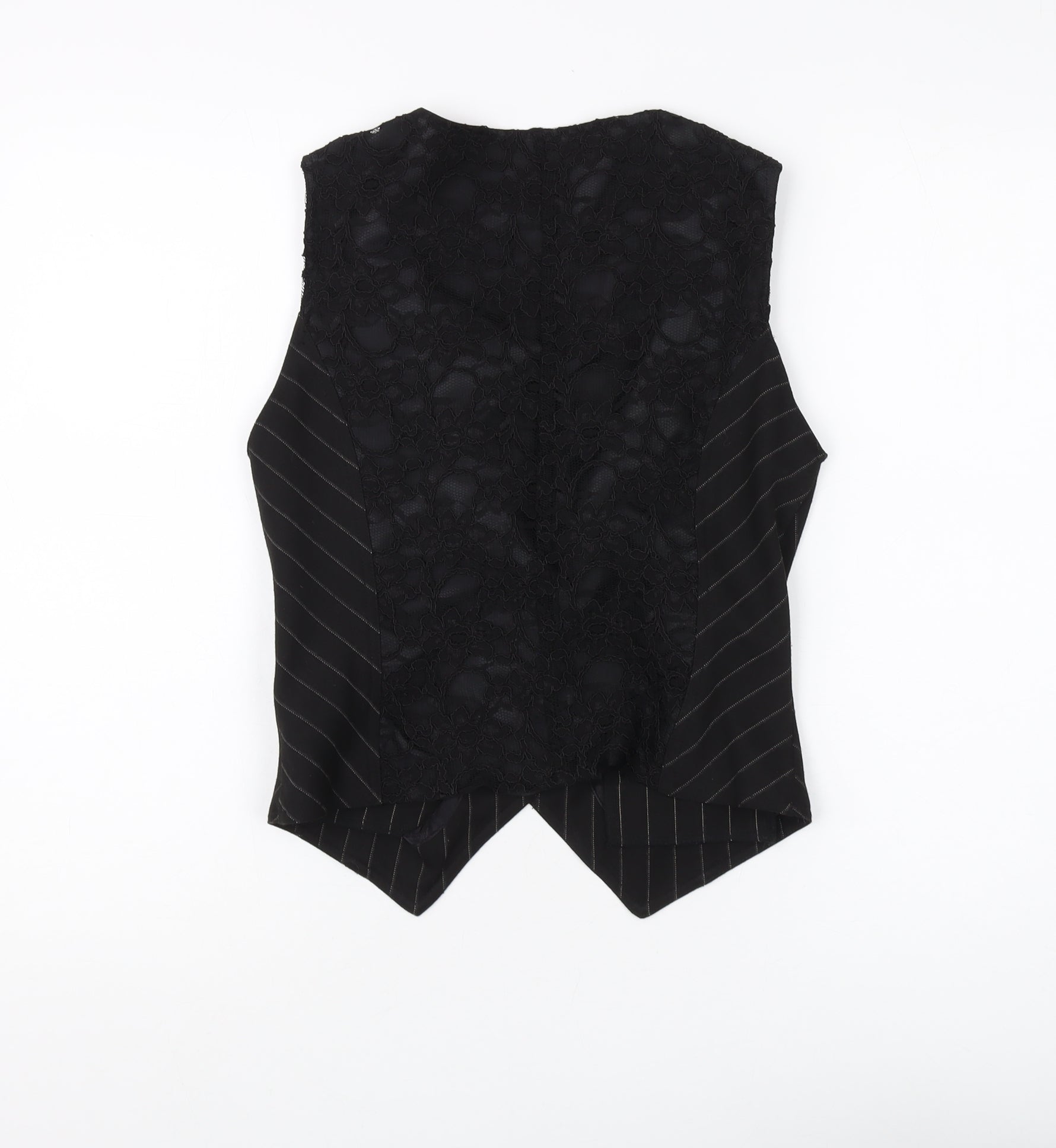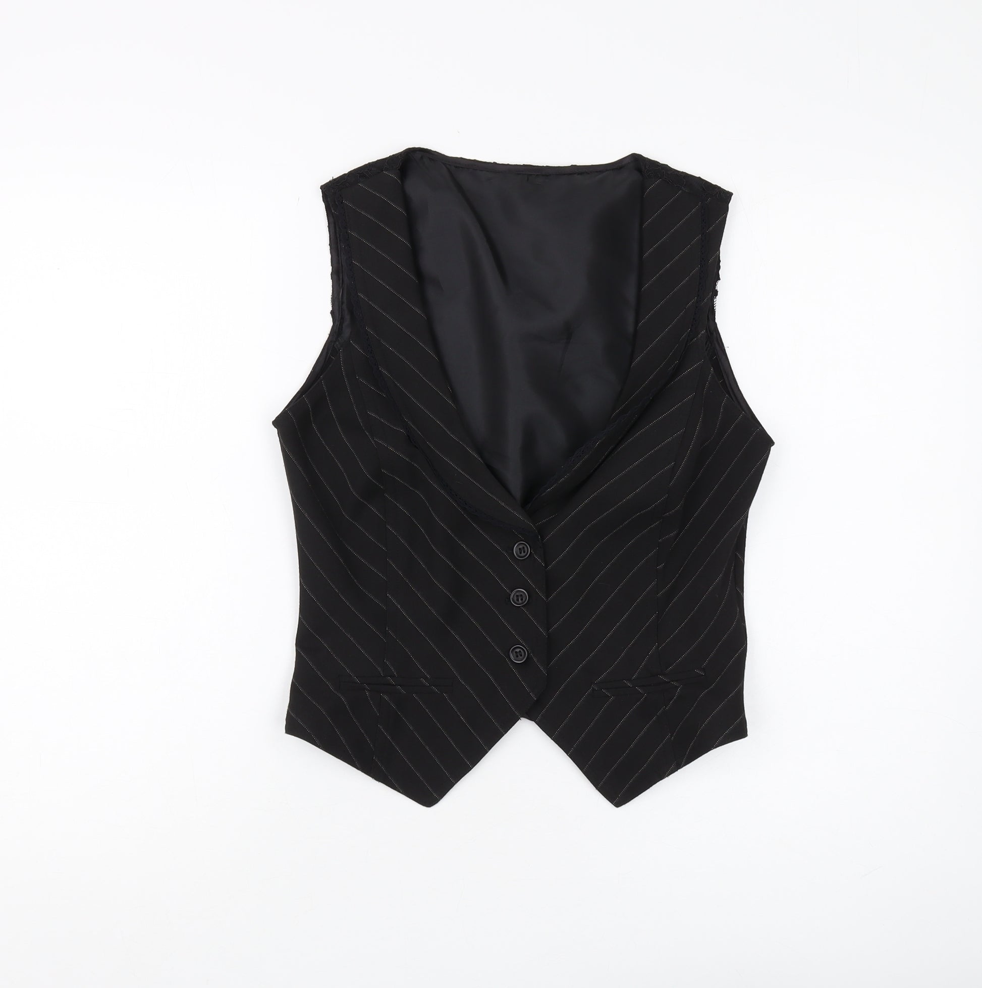 Elevate your wardrobe with this sophisticated black pinstripe waistcoat from New Look. Perfectly tailored for women, this stylish piece is designed in a sleeveless cut with a classic three-button front closure. Crafted primarily from a blend of polyester, cotton, and elastane, it offers comfort and a sleek look, making it suitable for various occasions. The elegant pinstripe pattern adds a touch of classic style, making it ideal for both formal and smart-casual events. Although in excellent pre-owned condition, this waistcoat shows no visible signs of wear, ensuring you receive a pristine product. Versatile and chic, it's a must-have addition to your collection. Don't miss out on enhancing your ensemble with this timeless piece.