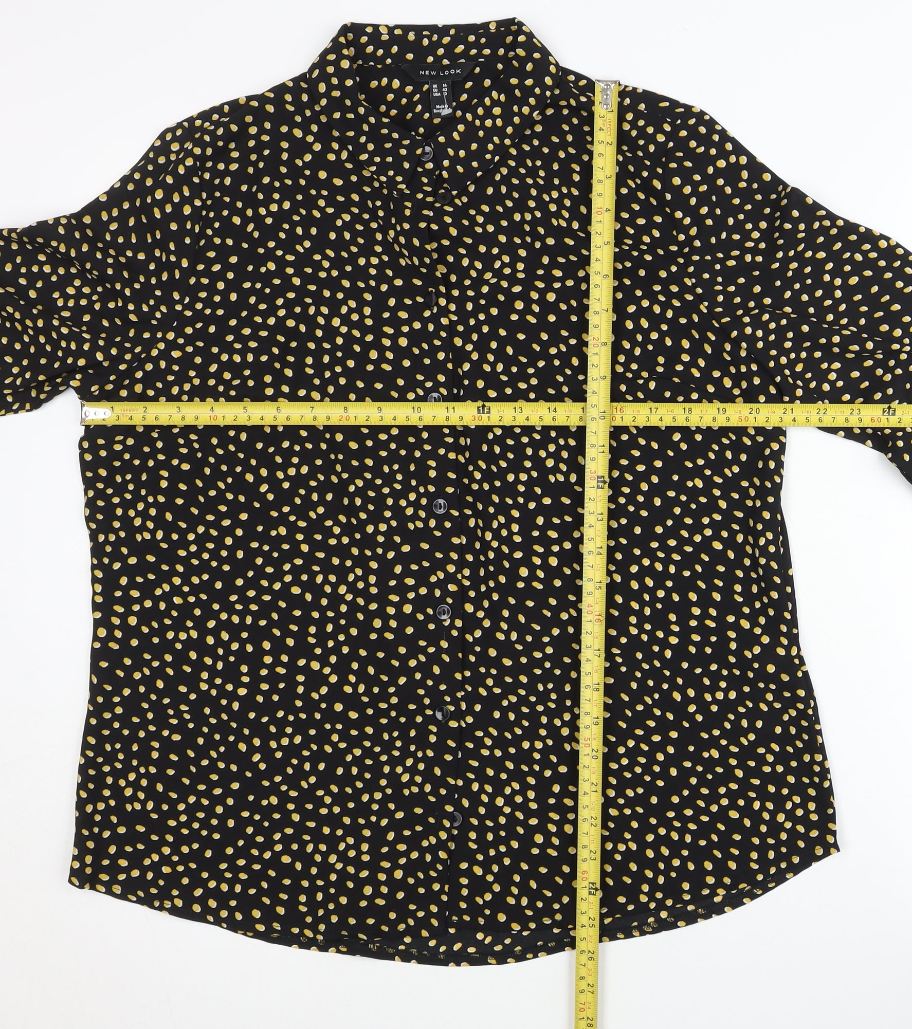 Add a playful yet polished piece to your wardrobe with this stylish New Look women’s button-up shirt in black with a vibrant polka dot print. Designed in a flattering UK size 14, this shirt offers a versatile option that can take you from casual daywear to smarter work looks with ease. Crafted from 100% polyester, this shirt provides a lightweight and breathable feel, making it a comfortable choice for warmer days while still being a great layering option during autumn. The woven fabric ensures added durability and a smooth drape for a sleek appearance. For style, it features a classic collared neckline paired with a button-up front, giving it a timeless structure that works well when worn both open over a vest or buttoned up for a sharper look. The long sleeves with fitted cuffs create a balanced silhouette, while the regular fit ensures ease of movement without compromising on style. The playful yellow and white polka dots scattered across the rich black background add a fun twist to an otherwise classic wardrobe staple, making it a statement piece while still being understated enough for multiple occasions. This shirt truly shines in its versatility — ideal for casual outings, smart-casual work settings, or even paired with denim or tailored trousers for a smart evening look. Its easy-care fabric means it’s machine washable and low-maintenance, perfect for a busy modern lifestyle. In excellent pre-loved condition with no visible flaws, this shirt still has plenty of wear to give. An affordable choice backed by reputable New Look quality, this button-up shirt offers a great mix of style, comfort, and practicality. Whether you dress it up with heels or style it down for a relaxed vibe, it’s a piece that can effortlessly fit into a wide range of outfits. Don’t miss the chance to add this chic and versatile shirt to your collection at a great price.