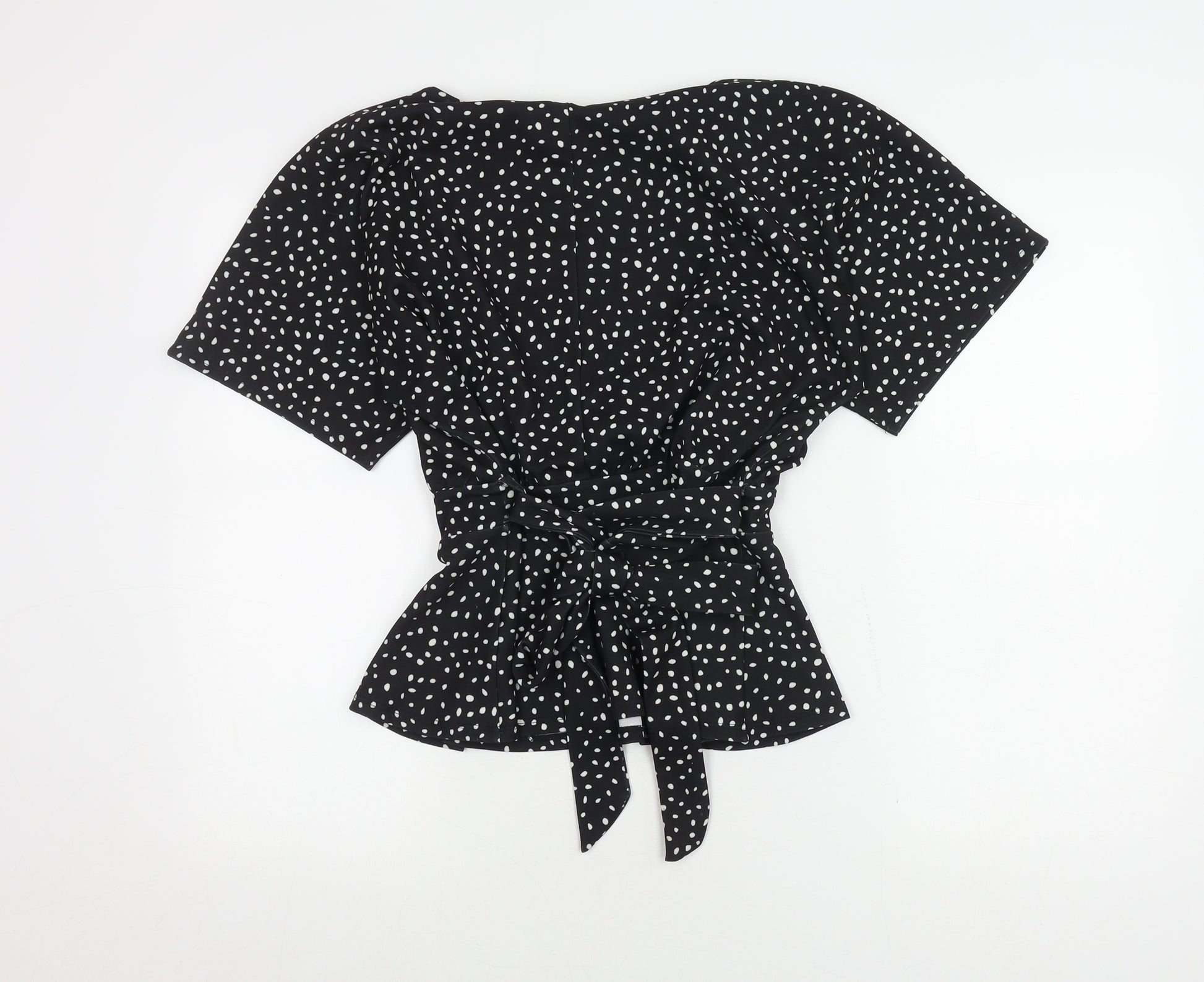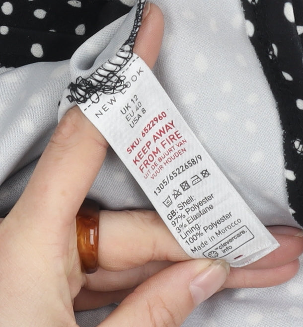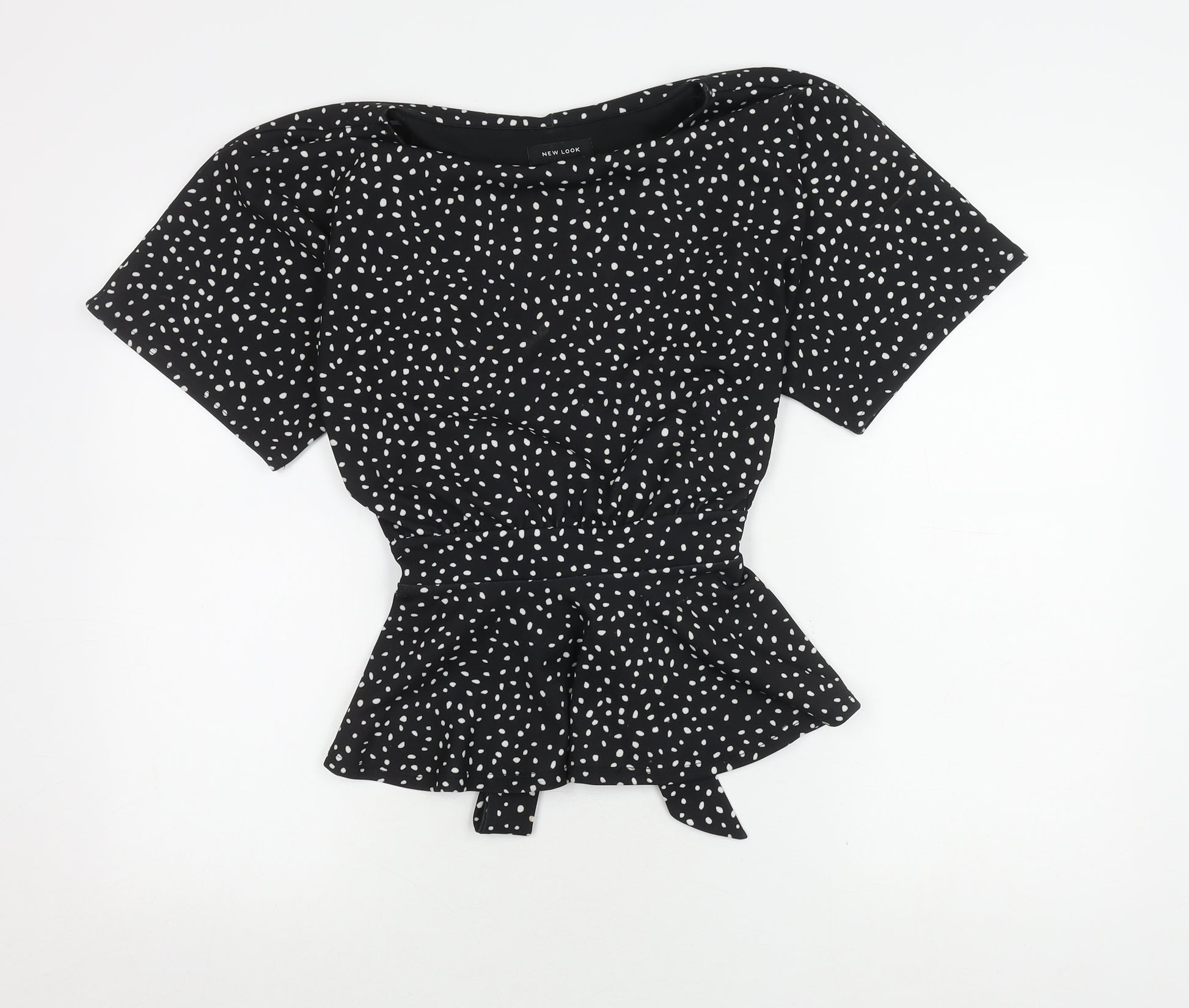 Elevate your style with this classic and chic polka dot top from New Look. Crafted from a comfortable blend of polyester and elastane, this top offers a flattering fit that's perfect for various occasions. The black background is adorned with playful white polka dots, adding a touch of whimsy to any outfit. Designed for women, this top features short sleeves that provide a breezy feel, making it ideal for warmer days. Although simple in design, the polka dot pattern gives it an effortless flair that can easily transition from casual outings to more formal settings. Perfectly versatile, this top can be paired with jeans for a laid-back look or dressed up with slacks for the office. The fabric is soft against the skin, ensuring all-day comfort. Whether you're heading out for a lunch date or attending a casual meeting, this top is a reliable choice to make a statement without compromising on style. In excellent condition, it has been gently worn and shows no visible signs of wear, offering you the assurance of quality. Embrace timeless elegance with this New Look polka dot top and make it a staple in your wardrobe today.