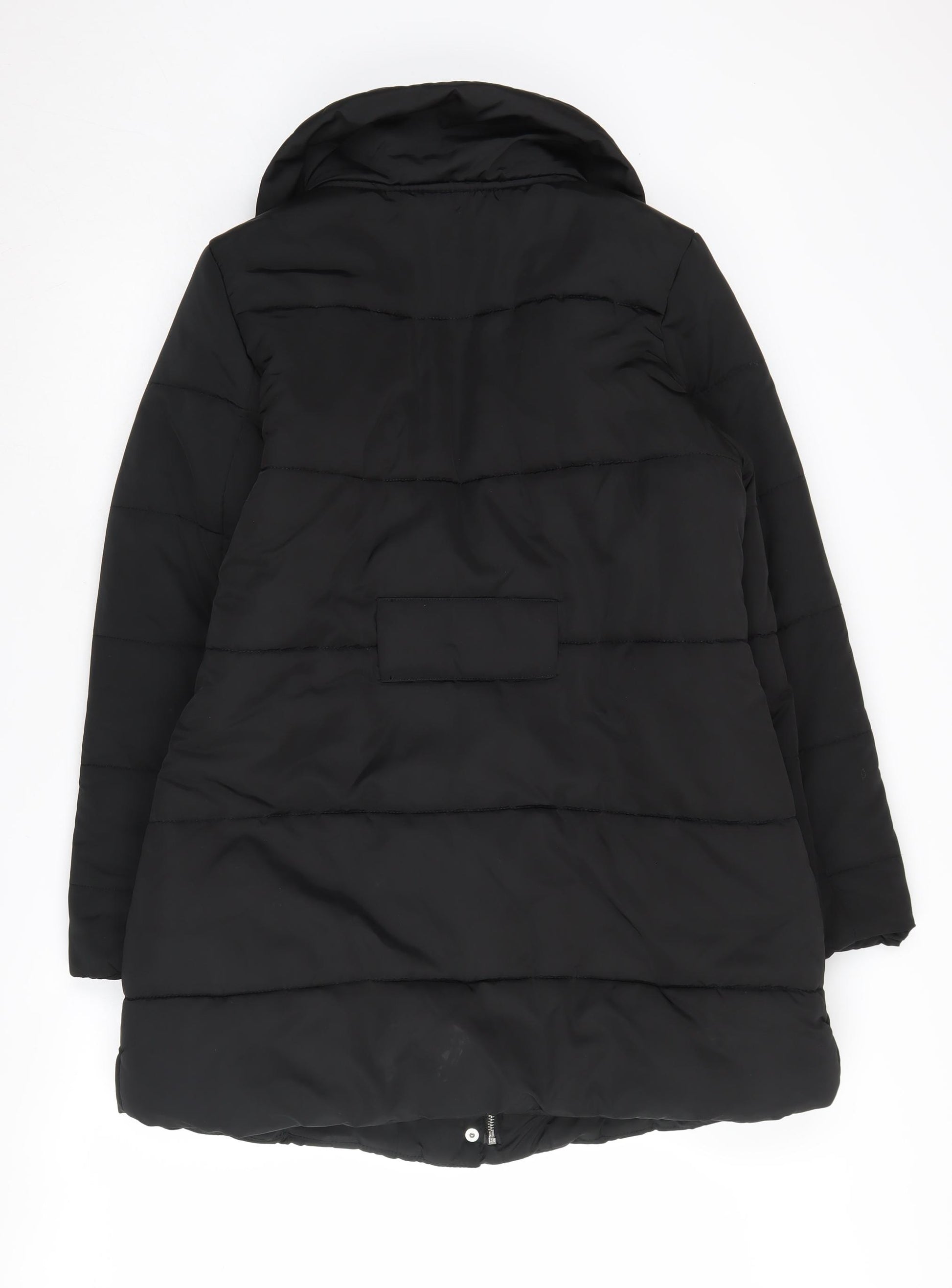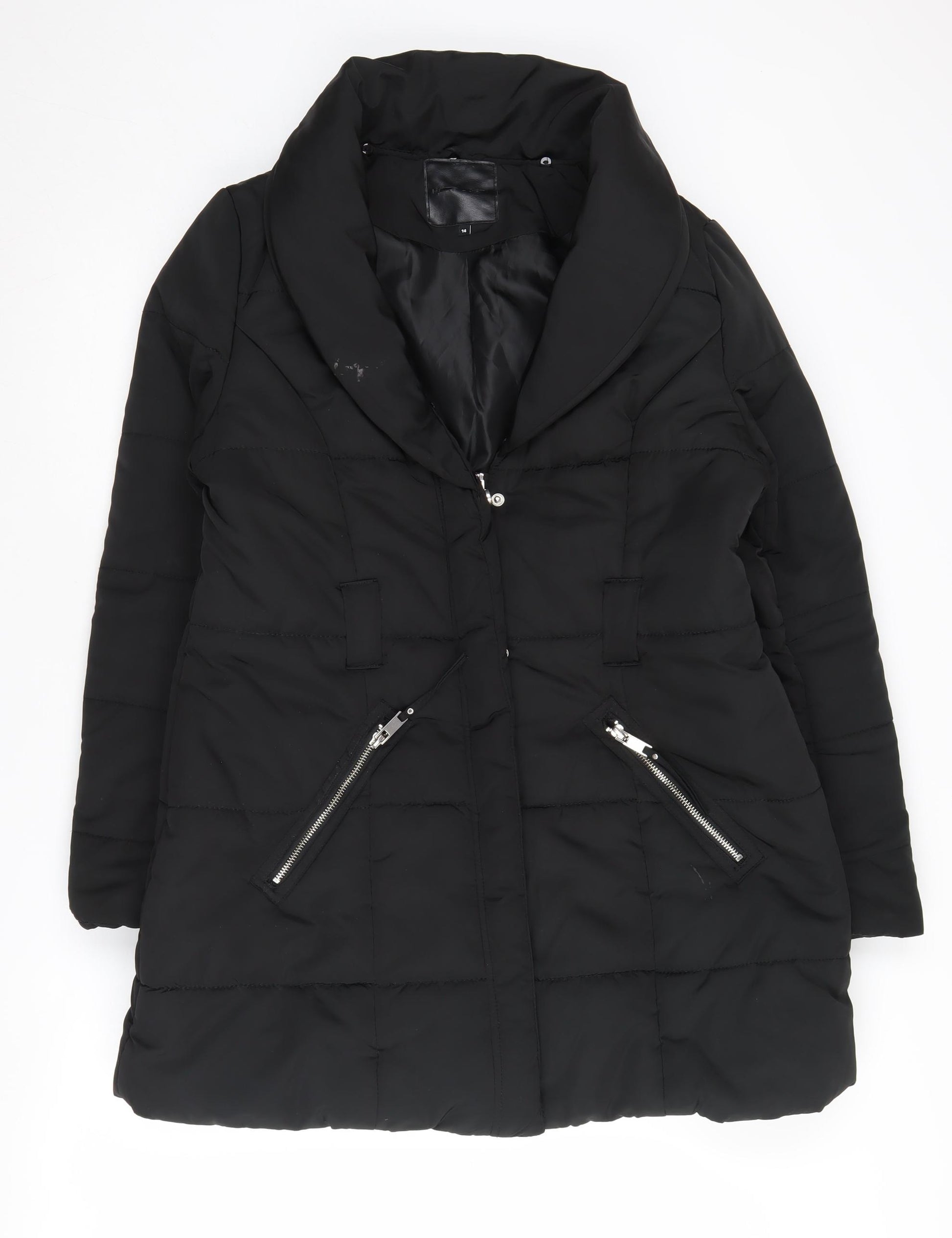 Stay warm and stylish with this New Look Women's Black Puffer Coat, perfect for the winter season. Crafted in a durable outer shell of polyester and nylon, this mid-length puffer jacket offers both warmth and a chic look. The coat features a convenient zip closure, streamlined design, and two practical zipped pockets for your essentials. Its fully lined interior provides extra insulation, ensuring you stay cozy even on the coldest days. The attached hood adds a layer of protection against unpredictable weather, making this coat a great companion for casual outings or daily commutes. Designed for comfort and durability, the coat is machine washable for easy care, making it ideal for everyday wear. Notice a small stain on the front, which does not affect the overall look and functionality. Grab this versatile piece in size 14 that pairs excellently with any winter outfit, effortlessly combining practicality with contemporary style.