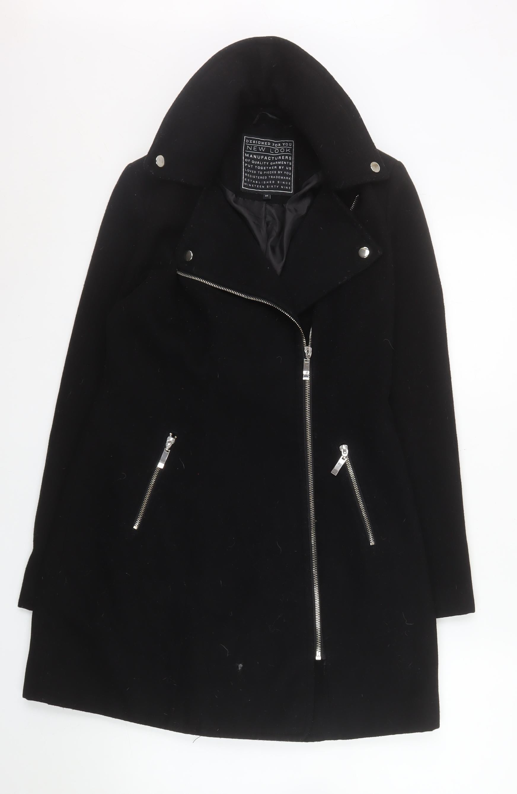 Elevate your outerwear collection with this chic New Look women’s black biker coat in size 10. Crafted from a soft and durable blend of polyester and wool, this mid-length coat offers both warmth and sophistication for the cooler months. The structured silhouette features a strong biker aesthetic, highlighted by an asymmetrical zip fastening, large notched collar with metallic press-stud accents, and sleek zip pockets that add a touch of edgy modern style. The fully lined interior ensures comfort and ease when layering over jumpers, dresses or smart casual outfits. Designed for women who appreciate classic tailoring with a contemporary twist, this coat transitions effortlessly from day to night and from casual walks to office wear. The timeless black colour enhances versatility, pairing beautifully with any colour palette. Subtle details, such as silver-tone hardware and streamlined seams, elevate the design without compromising its minimalist appeal. Perfect for autumn and winter, it provides warmth without bulk, making it a reliable companion through changing seasons. Pair it with jeans and ankle boots for an effortless everyday style or dress it up with tailored trousers and heeled boots for a refined evening look. The combination of practicality and sophistication makes it a wardrobe staple for women who love enduring classics with a modern edge. This pre-loved coat remains in very good condition, showing only light surface wear and minor lint consistent with gentle use. Add this stylish and versatile biker coat to your wardrobe to stay warm and effortlessly polished throughout the colder months — a true investment in timeless, wearable fashion.