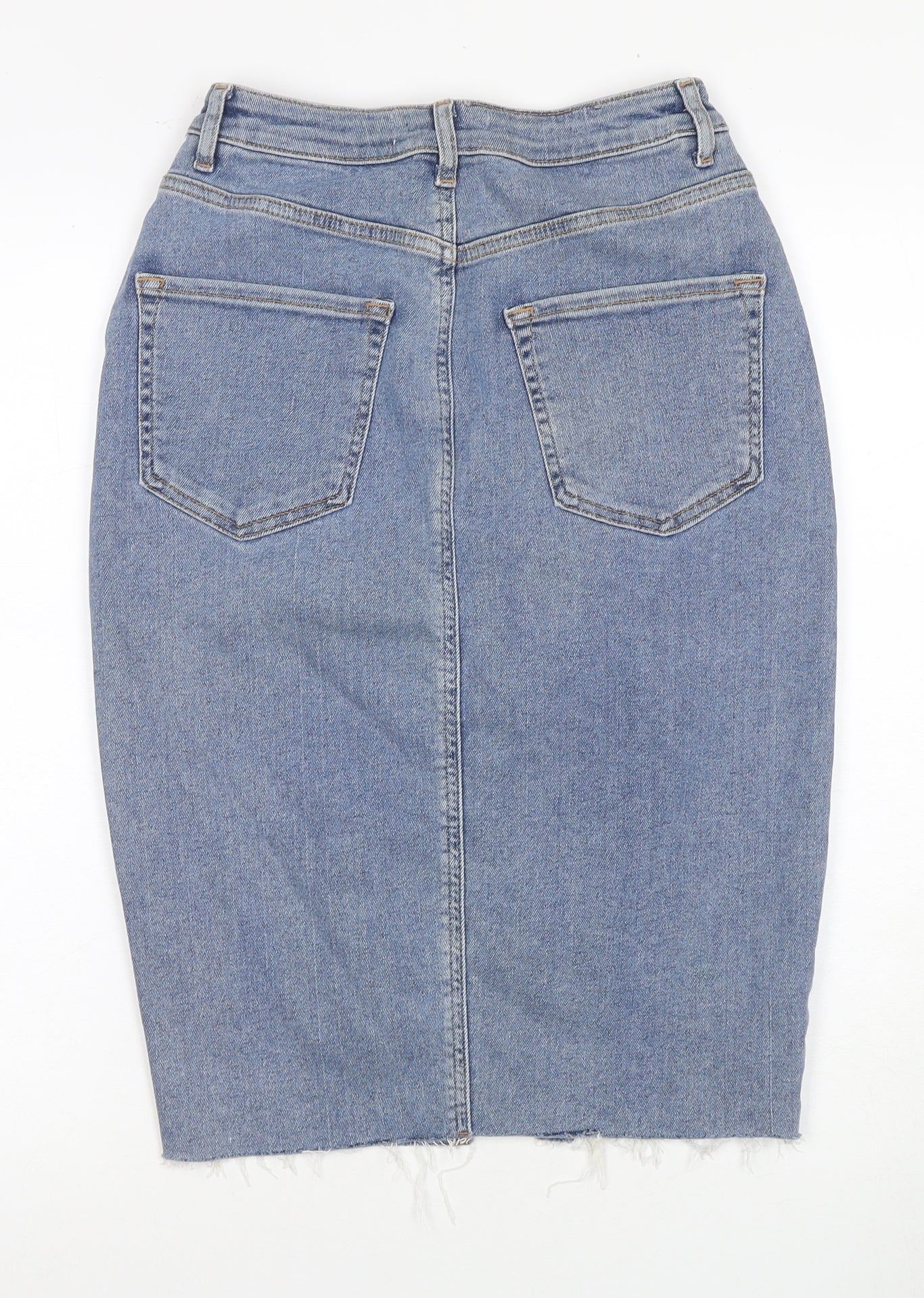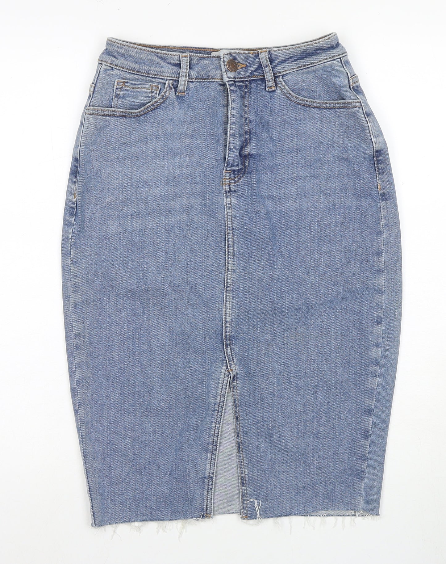 Step out in timeless style with this classic New Look denim skirt. Crafted for ultimate comfort and a flattering fit, it features a versatile blue shade that pairs effortlessly with a range of tops and shoes. This midi-length pencil skirt provides a sleek silhouette, making it perfect for both casual outings and more polished settings. Designed with practical elements like front and back pockets, and a subtle front slit for ease of movement, it embodies a blend of fashion and function. The cotton and elastane fabric promises durability and a slight stretch for added comfort. With its button and zip closure, getting dressed is a breeze. Ideal for all seasons, this skirt maintains a modern edge with a raw hem detail. Whether you dress it up or down, it's a piece you'll reach for time and again. Perfect for those seeking a chic yet casual piece to complement their wardrobe.