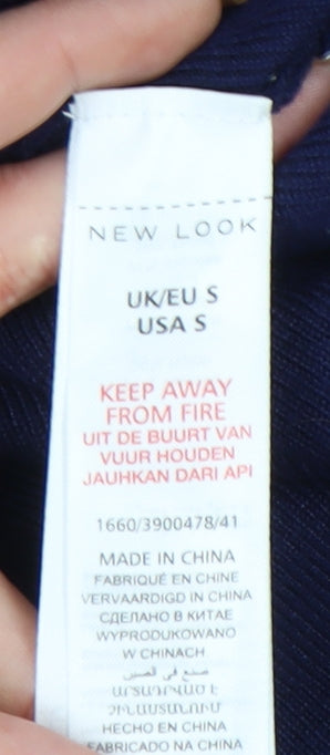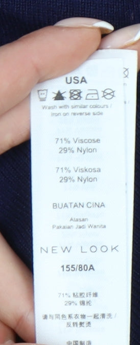 Elevate your cold-weather wardrobe with this stylish women’s blue jumper from New Look. Designed with a modern mock neck and sleek long sleeves, this pullover offers both warmth and elegance, making it a versatile addition to your autumn and winter outfits. The deep navy blue colour provides a sophisticated and timeless base, ideal for both casual wear and layering under coats and jackets when temperatures drop.Crafted from a blend of 71% viscose and 29% nylon, the fabric provides a soft, comfortable feel with added durability and flexibility. The lightweight knit construction ensures breathability without compromising on warmth, making it a cosy yet practical piece that’s perfect for everyday wear. Designed for the modern woman, the classic fit sits well on the body without being too tight, offering both comfort and style in one.Accented with statement silver-tone button details along both sides near the hem, this piece adds a touch of uniqueness and subtle interest to a minimalist design. Its smart silhouette and no-pattern construction mean it can be dressed up or down with ease. Pair it with jeans and trainers for a relaxed weekend look, or tuck it into tailored trousers or a skirt for a polished office-ready outfit.This jumper is machine washable and easy to care for, making it a practical wardrobe staple. With its versatility, it transitions effortlessly between casual daytime occasions and more elevated evening wear with just a few styling tweaks. The mock neck ensures added warmth without the bulk of a full roll neck, striking a balance between fashion and function.In very good pre-loved condition, this New Look jumper shows only minimal bobbling and light creasing, offering excellent value and wearability. Comfortable, flattering, and timeless, it’s an essential piece for anyone looking to invest in an affordable, stylish, and easy-to-style knitwear option this season.