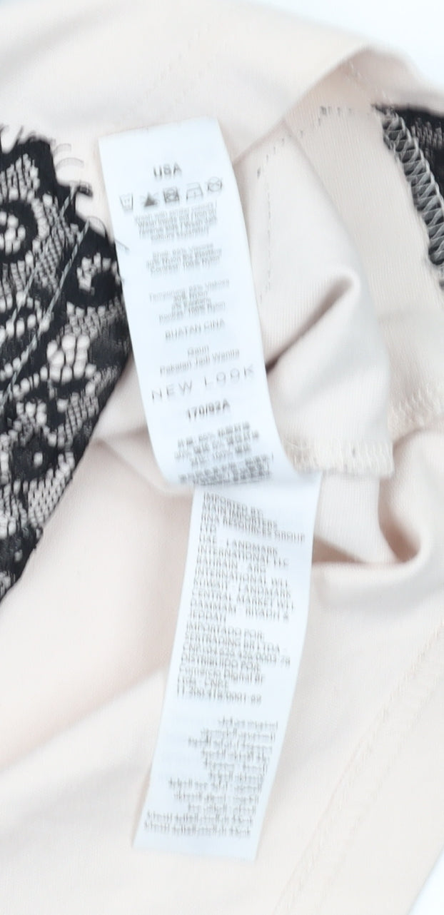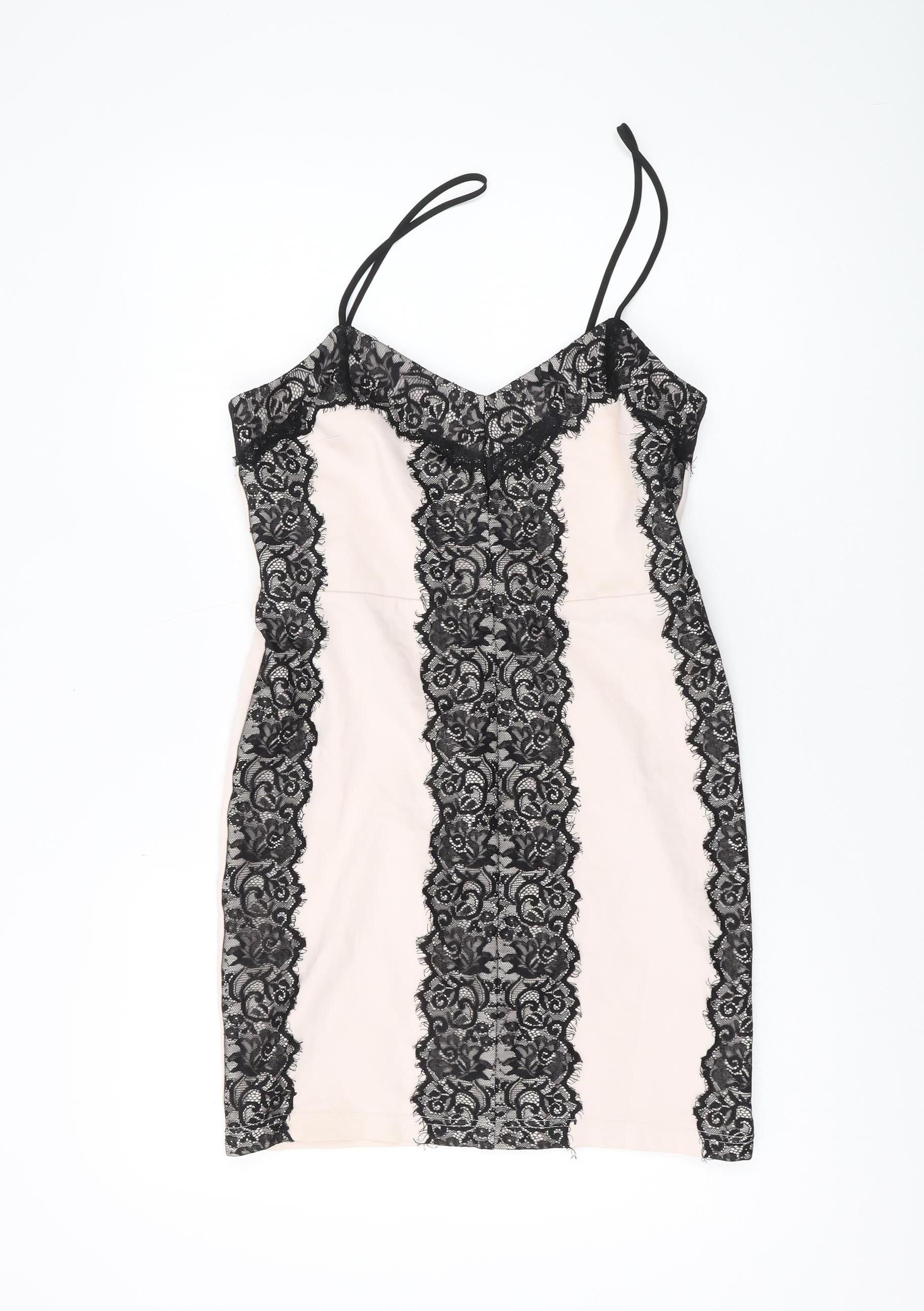 Elevate your wardrobe with this exquisite New Look bodycon dress, perfect for any party or cocktail event. Featuring an elegant ivory hue adorned with delicate black lace accents, this dress is designed to make a statement. The form-fitting bodycon style flatters your silhouette, while the sleeveless design and strappy sleeves add a touch of modern sophistication. Crafted from a blend of cotton, nylon, and elastane, this dress ensures comfort and a slight stretch for the perfect fit. The V-neckline adds a hint of allure, while the convenient zip closure at the back provides ease of wear. Ideal for summer, this dress can be paired with your favourite heels and accessories for a complete look. Machine washable for easy care, it is an essential addition to any fashion-forward woman's collection. Don't miss out on this beautiful piece that's ready to impress at your next event.