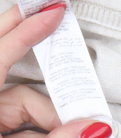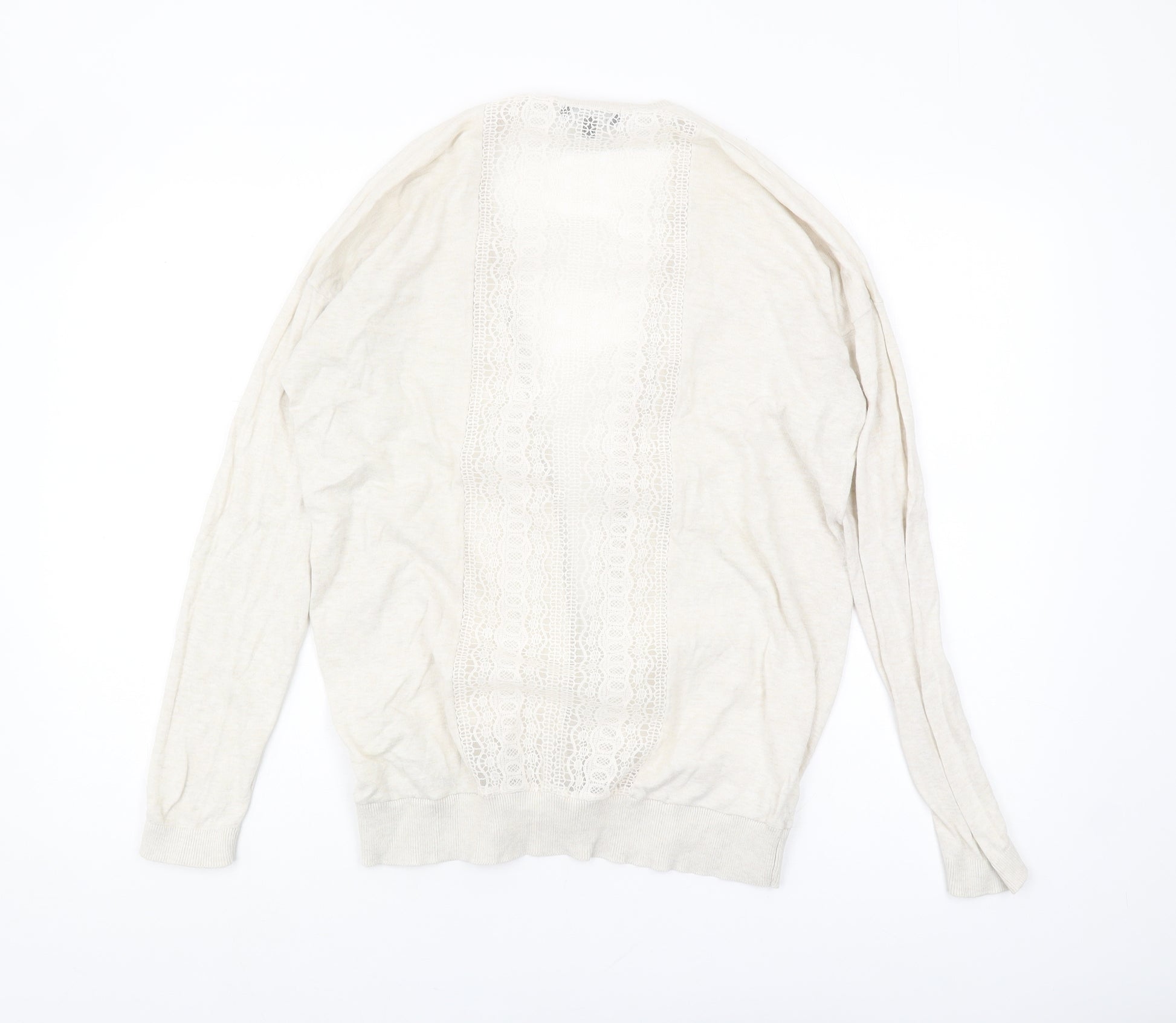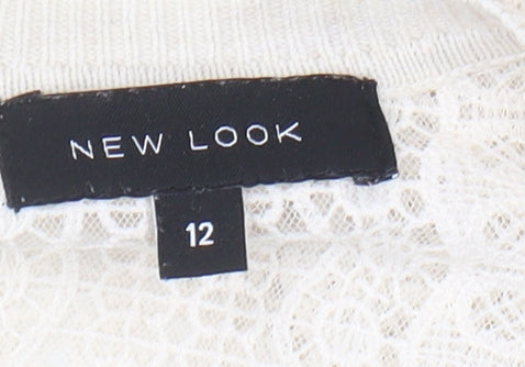 Step out in style with this elegant ivory cardigan from New Look, perfect for adding a sophisticated touch to your wardrobe. Crafted from a blend of cotton and nylon, this cardigan features a lightweight open-knit design with gorgeous lace accents that are sure to turn heads. In a versatile size 12, it provides a comfortable fit for every occasion, whether you're dressing up for a day at the office or enjoying a casual outing with friends.Its regular fit and long sleeves make it an ideal choice for layering over your favourite tops, adding both warmth and style. Perfect for all seasons, this cardigan's timeless design ensures it will remain a staple in your collection for years to come. The lack of labels or tags indicates it has been gently worn, yet it remains in excellent condition with no visible defects.Hand washable for easy care, this cardigan is both practical and chic. Its knit and lace fabric exudes a touch of feminine elegance, making it suitable for casual occasions or elevating your everyday look. Whether paired with jeans or a skirt, this ivory cardigan is a versatile piece that enhances any ensemble.Affordable and stylish, this cardigan is a must-have addition to any fashion-forward wardrobe. Reimagine your style with this beautiful, lightweight piece that combines comfort and fashion effortlessly.