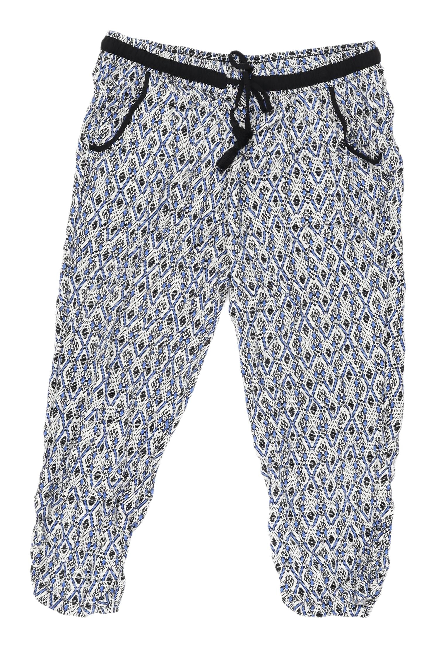 Discover comfort and style with these women's cropped trousers from New Look, adorned with a captivating geometric pattern in multicoloured shades. Crafted from soft 100% viscose, these trousers promise a breathable and lightweight feel, perfect for your spring and summer wardrobe. Featuring an elastic waist and convenient pockets, they offer practicality alongside a fashionable look. The drawstring closure ensures an adjustable fit for all-day comfort. Suitable for casual occasions, these regular fit trousers provide versatile styling options. Despite being pre-loved, they are in excellent condition with no visible defects, making them a fantastic addition to your collection.