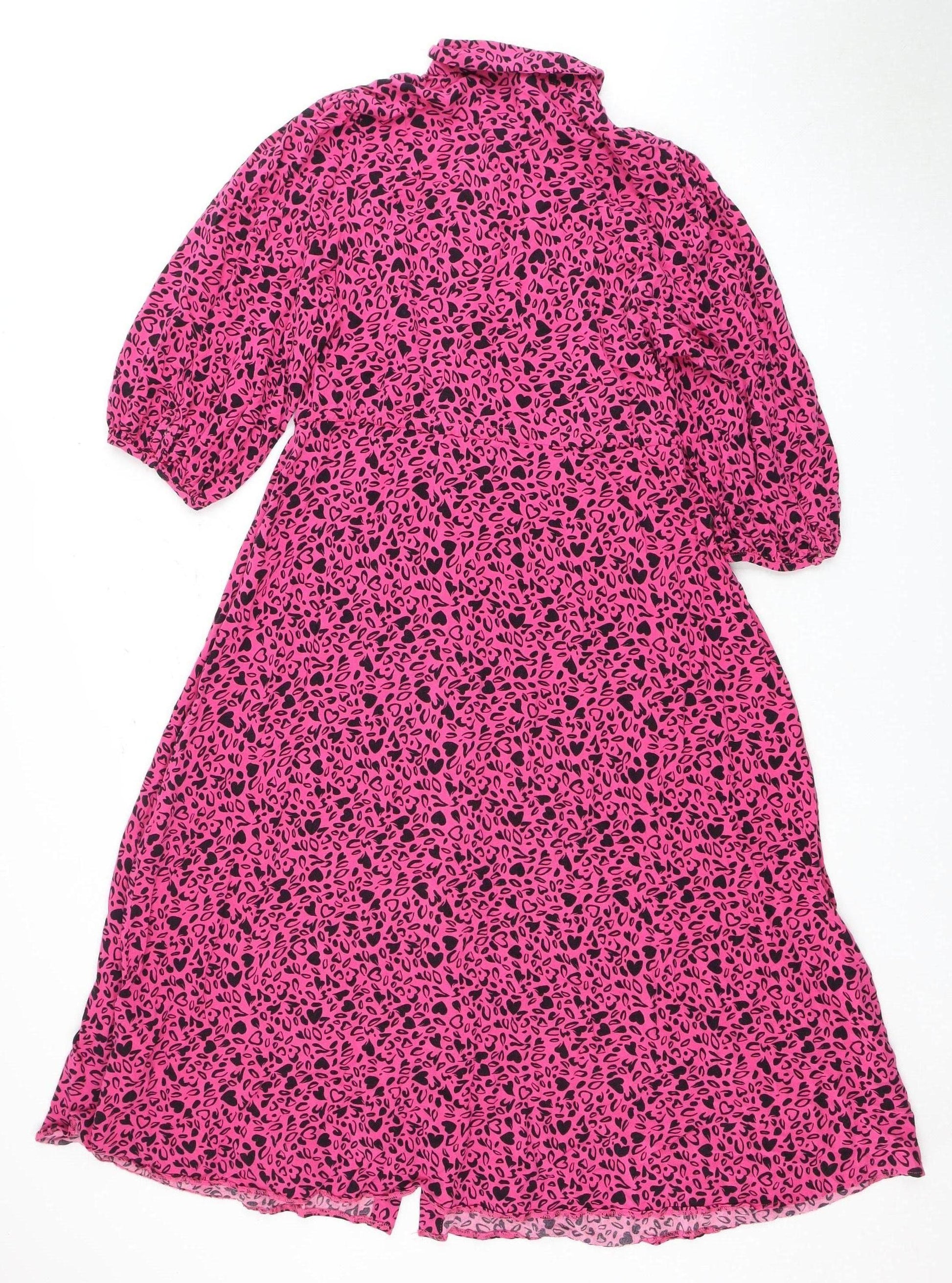 This New Look A-Line dress in size 10 features a vibrant pink and black animal print, perfect for adding a touch of fun to your casual wardrobe. Its midi length and lightweight jersey fabric make it ideal for staying comfortable yet stylish throughout the spring and summer seasons. The dress boasts a flattering collared neckline and an easy button closure, complimented by elegant 3/4 balloon sleeves. Designed for women, this dress combines style and functionality, ideal for various casual occasions. With its eye-catching design and soothing colours, this dress is sure to earn you some compliments wherever you wear it. Machine washable for easy removal of any stains, this wardrobe staple is not only practical but also effortlessly stylish. Whether paired with sandals for a relaxed daytime look or dressed up with accessories for a chic evening outfit, this New Look dress is a versatile choice for anyone seeking both comfort and style.