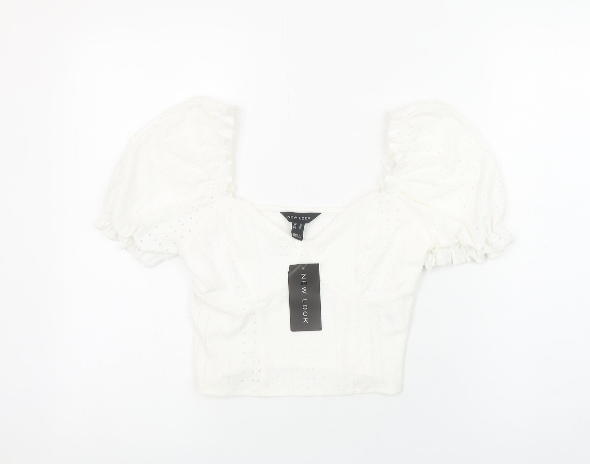 Bring a dreamy, romantic touch to your wardrobe with this New Look Women's White Puff Sleeve Cropped Blouse in size 10. Perfect for adding charm to any outfit, this versatile top features a flattering square neckline and playful puff sleeves with delicate ruffle detailing at the cuffs. Its cropped silhouette makes it an ideal choice for pairing with high-waisted jeans or a flowy skirt, creating a chic and feminine look suited for casual outings or summer gatherings. Designed with comfort and style in mind, this blouse is made from a soft, lightweight woven fabric blend of polyester and elastane, offering a slight stretch for an elegant, body-skimming fit that moves with you. The main body consists of 65% polyester, 30% recycled polyester, and 5% elastane, ensuring both durability and a sustainable edge. Finished in classic crisp white, it complements all skin tones and easily coordinates with your wardrobe staples. The pullover design keeps it effortless to wear, while the breathable fabric makes it ideal for spring and summer days. Whether you’re attending a daytime brunch, an evening party, or simply upgrading your everyday essentials, this lovely cropped blouse promises a polished yet playful look. Easy to care for, it is machine washable and best reshaped whilst damp to maintain its structure. This top embodies a modern romantic vibe while offering practicality, aligning perfectly with New Look’s signature feminine aesthetic. Perfectly suited for women who love chic yet comfortable fashion, this blouse is a must-have for your seasonal style rotation. Brand new with tags, it delivers retail freshness and quality assurance. A beautiful and versatile piece that transitions effortlessly from day to night, bringing timeless appeal to any outfit rotation.