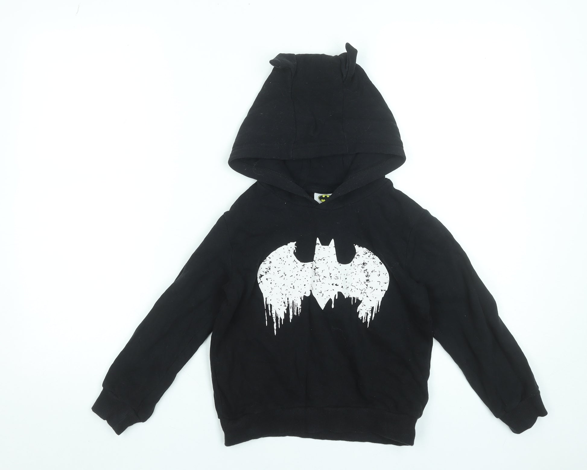Let your little superhero embrace their inner vigilante with this Next Boys Batman Hoodie in classic black. Made from a comfortable cotton blend of 85% cotton and 15% polyester, this pullover hoodie promises softness and durability — perfect for everyday adventures or cosy days at home. Designed in a regular fit for ages 5–6 years, it features a bold white distressed Batman logo across the chest, bringing a touch of comic book style to your child’s wardrobe. The hood includes fun little bat ear details, adding a playful twist inspired by the Dark Knight himself.Crafted from lightweight jersey fabric, it’s machine washable for easy care and suitable for all seasons. The long sleeves and ribbed cuffs keep your child snug during cooler months, while the breathable fabric ensures comfort in milder weather. The graphic logo accent lends a distinctive superhero flair, making it a favourite piece for fans of the Caped Crusader.Perfect for casual outings, school days, or costume-themed events, this versatile Batman hoodie adds style and practicality to any outfit. Though pre-owned, it remains in very good condition with only light signs of wear. Whether paired with jeans or joggers, this hoodie is ready to defend Gotham — or at least the playground — in superhero comfort and style. A fantastic find for parents seeking fun, quality, and great value in one iconic look.