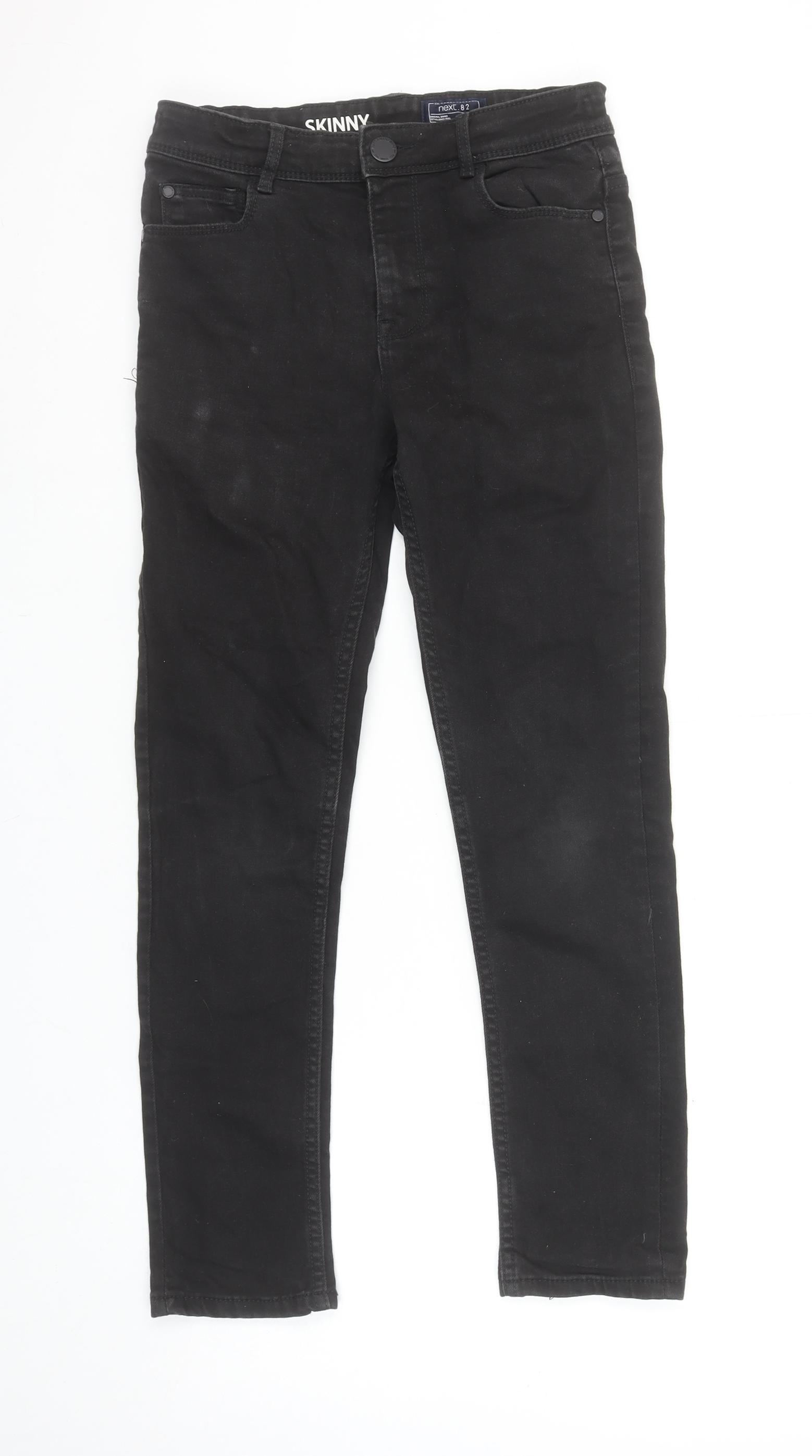 Keep your young trendsetter looking stylish and comfortable with these classic black skinny jeans from Next. Tailored for a slim, modern fit, these jeans are designed for boys aged 12 years (height 152 cm) and crafted from a soft, durable blend of 98% cotton and 2% elastane. This premium denim fabric offers just the right amount of stretch for flexibility and ease of movement, making them perfect for everyday wear. With a sleek black wash, these jeans can easily be dressed up or down — ideal for school days, weekends, or casual outings. The standard button and zip closure provide a secure fit, while belt loops add versatility for different styles. Two front pockets and back patch pockets offer practicality, ensuring there’s space for small essentials.Made with comfort and durability in mind, these jeans feature a slightly elastic waistband that helps ensure a snug but comfortable fit through the waist and hips, perfect for an active young lad. The dark fabric wash gives a polished, modern look and pairs effortlessly with both bright tees and cosy jumpers.Machine washable and designed for easy care, these jeans are built to withstand the daily adventures of growing boys. Though pre-loved, they remain in excellent condition with just light wear consistent with careful use. A reliable wardrobe staple that brings together comfort, practicality, and timeless style. Elevate his everyday outfits with these quality Next skinny jeans — ideal for school, play, and any occasion that calls for effortless style and durability. A must-have addition to any young wardrobe.