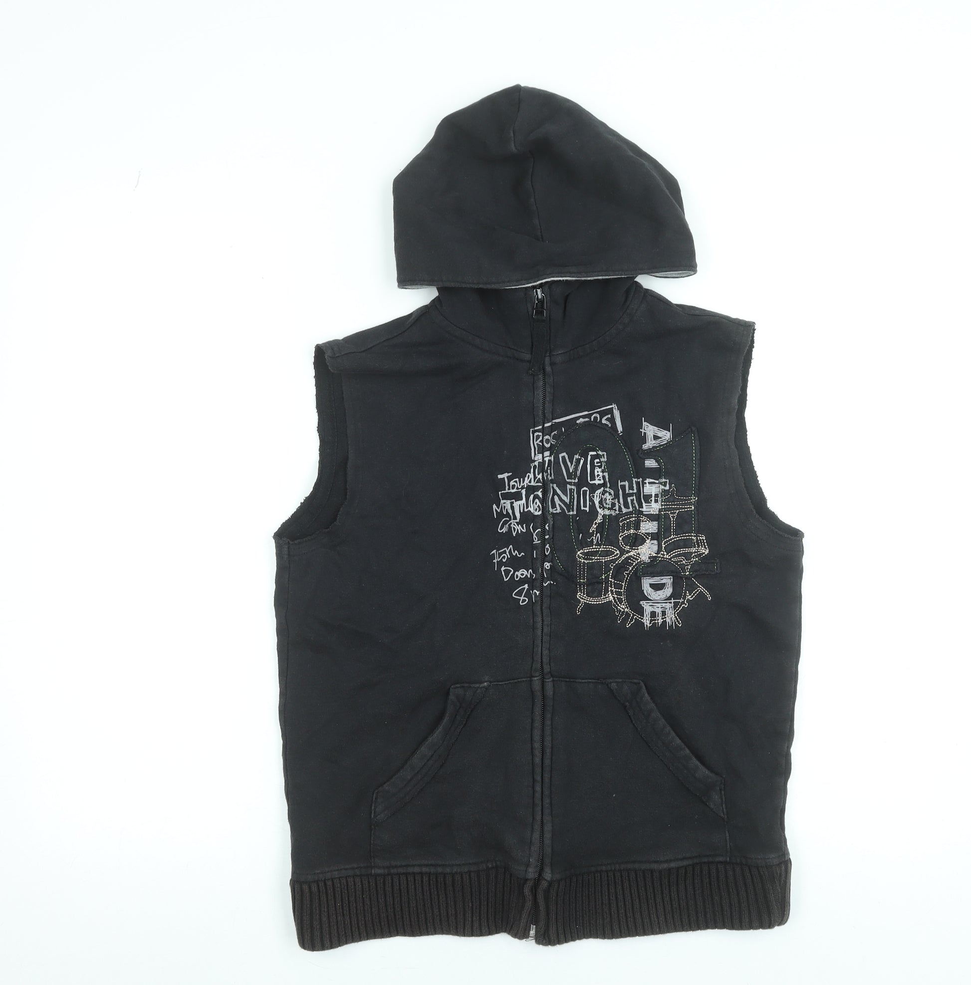 Add a touch of rock-inspired style to your child’s wardrobe with this boys’ black sleeveless hoodie vest from Next. Crafted from soft and breathable 100% cotton jersey, this hoodie combines everyday comfort with an edgy design. The front showcases a distinctive embroidered drum and text motif with the words 'Live Tonight' and 'Attitude' that give off a confident, music-inspired vibe perfect for casual wear. Designed with a full front zip closure, it’s easy for kids to put on and take off independently, making it ideal for layering during transitional seasons like spring and autumn. The soft ribbed hem ensures a comfortable fit, while the attached hood adds a relaxed and sporty touch that keeps him warm on cooler days.With front kangaroo-style pockets for chilly hands or small essentials, this vest keeps functionality and style at the forefront. The black colour provides a timeless and versatile base that pairs effortlessly with jeans, joggers, or shorts, making it a go-to piece for trips to the park, casual outings, or school days. The high-quality cotton fabric ensures durability and long-lasting softness even after multiple washes. Suitable for boys aged around 9 years with a height of 134 cm, it offers a regular, comfortable fit that allows easy movement for everyday play and adventure.In very good pre-owned condition, this item is free of stains or rips but does not have its original sales tags. A practical addition to any young boy’s wardrobe, this sleeveless zip hoodie is a versatile layering essential that captures youthful energy with a rock 'n' roll twist. Whether layered over a long-sleeve tee or worn on its own during warmer days, it’s a stylish choice that balances comfort, expression, and individuality seamlessly.