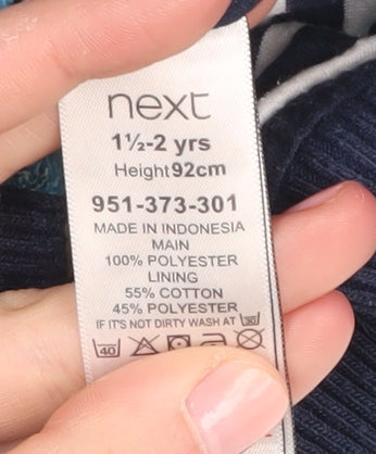 This charming blue bomber jacket from Next is perfect for your little boy's adventurous outings. Designed for boys aged 1-2 years, this jacket features a vibrant nautical graphic that inspires a sense of wonder and curiosity. The jacket is crafted from 100% polyester, ensuring durability and ease of care with machine washability. Equipped with a functional hood and full zip closure, it provides comfort and protection against spring and summer elements. The lining is a comfortable blend of cotton and polyester, adding a soft touch against the skin. Although it shows minor signs of wear with minor stains and no tags, it remains in good condition, making it a practical and stylish addition to any young explorer's wardrobe. The beautiful blue hue, short length, and classic bomber style ensure that this piece is both trendy and practical, perfect for casual occasions and outdoor play. Don't miss out on this delightful jacket that seamlessly combines style and comfort, setting your child ready for new adventures.