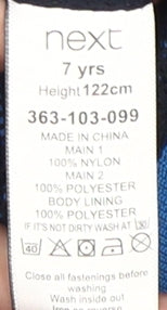 Explore the outdoors in style with this boys’ jacket from Next, perfect for ages 7. Fashioned in a striking colourblock design, this blue jacket is an ideal choice for both spring and autumn wear. Crafted with a robust nylon and polyester blend, it ensures durability and a lightweight feel, perfect for lively outdoor activities. Its hooded feature provides additional protection against brisk winds, while the lined interior offers comfortable wear throughout the day.Equipped with a sturdy zip closure and convenient zipped pockets, this jacket combines functionality with modern style. It's designed to withstand everyday adventures, making it a versatile addition to any young explorer's wardrobe. The woven fabric and regular fit offer a classic look, suitable for a range of casual occasions.Machine washable for easy care, this jacket is designed to maintain its excellent condition wash after wash. Whether it's a family outing, a day at the park, or a school day, this jacket offers a stylish and practical choice for the young adventurer. Grab this essential piece for your child's wardrobe, ensuring they stay cozy and fashionable while exploring the world around them.