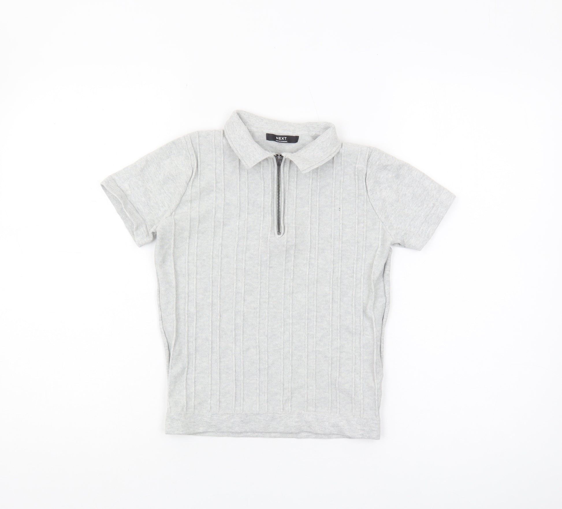 Introduce a touch of effortless style to your child's wardrobe with this Next Boys Grey Zip Polo Jumper. Crafted from a comfortable blend of 90% cotton and 10% nylon, the soft and breathable fabric ensures your little one stays cosy and stylish throughout the day. The grey hue lends a versatile and classic appearance, making it easy to pair with any outfit. The short sleeves and collared neckline with a 1/2 zip closure add a trendy and practical element, perfect for active kids. Ideal for the warmer seasons of spring and summer, this jumper is a great option for casual outings, school days, or playdates. With a cable-knit design and short sleeves, it provides just the right amount of coverage and flexibility for unrestricted movement. Designed for boys aged 8 years, this jumper offers a regular fit that's both comfortable and fashionable. The garment's excellent condition ensures durability and longevity, providing excellent value for money. Whether you're seeking a new addition to your child's wardrobe or a versatile layering piece, this jumper ticks all the boxes for style, comfort, and practicality.