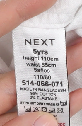 This Next Boys White Button-Up Shirt is perfect for casual occasions and features a classic design with short sleeves and a neatly buttoned-down collar. Made predominantly of breathable cotton with a touch of elastane to ensure a comfortable fit, this shirt is both stylish and practical. Its solid white colour makes it versatile for pairing with various bottoms, and the subtle logo accent adds a touch of class. Although pre-loved, the shirt is in good condition with some minor stains which are visible, making it ideal for everyday wear or as a backup in the wardrobe. Easy to maintain, this machine washable shirt is perfect for active young boys. Available in a size suited for 5-year-olds, it is designed to keep your child looking smart and feeling comfortable during the spring and summer months.