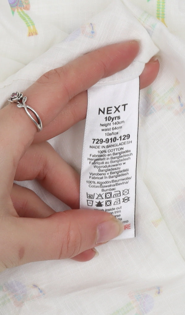 Brighten up your child’s wardrobe with this crisp white short sleeve button-up shirt from Next, designed for boys aged 10 years. Crafted from 100% cotton, the shirt offers a soft, breathable and lightweight feel perfect for warmer months. The playful all-over flamingo print brings a touch of fun and colour, making it a standout choice for holidays, summer parties, or everyday casual wear. The classic collared neckline and full button closure give it a smart yet relaxed look that’s easy to style with jeans, shorts or chinos. The cotton fabric ensures lasting comfort and durability, while the high-quality woven finish maintains a neat and polished appearance wash after wash. Featuring short sleeves and a regular fit, it allows for full movement and keeps kids feeling cool all day long. This shirt is ideal for school breaks, family outings and special occasions where style meets ease. Its white base with multicoloured flamingo motifs adds a cheerful and trendy vibe, making it perfect for both casual and dressy moments. Machine washable for low-maintenance care, this Next boys’ shirt is a great blend of charm and practicality. In excellent pre-loved condition, it shows no signs of wear or damage and has been well cared for. Without original tags but freshly laundered and ready to wear, it’s a great choice for parents looking for stylish, quality clothing at an affordable price. Add this fun and versatile Next shirt to your child’s collection and give them a comfortable yet smart outfit option for any sunny day adventure.