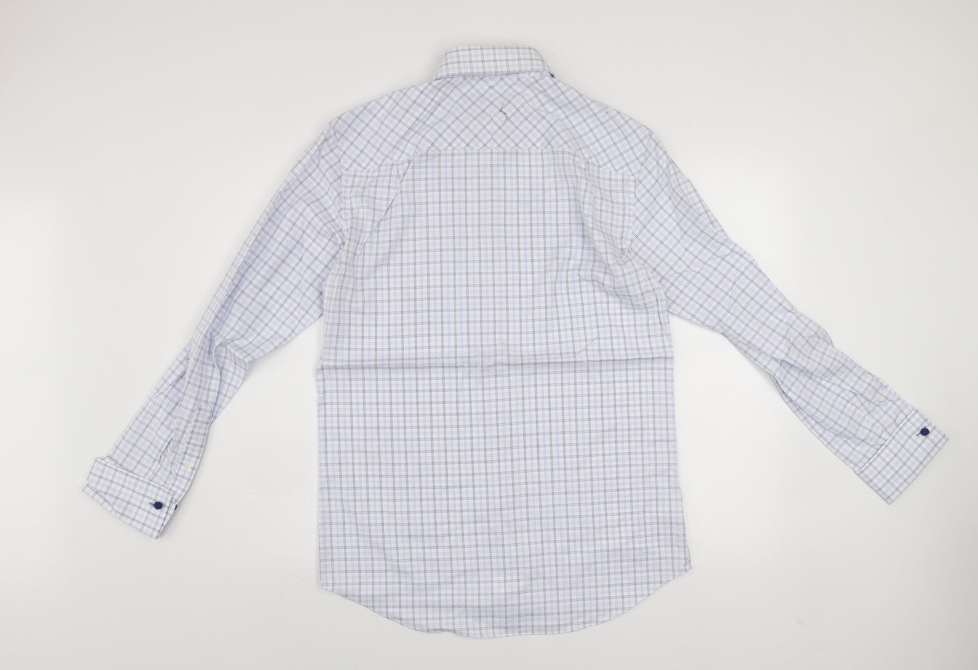 Elevate your formal wardrobe with this smart and stylish blue check shirt from the renowned Next City Collection. Expertly crafted from 100% quality cotton, this shirt offers superior comfort, a breathable texture, and a polished appearance ideal for professional and dressed-up occasions. Designed in a Regular Fit cut, it ensures ease of movement while maintaining a sharp and structured silhouette that works perfectly under a tailored suit or on its own for a refined business-casual look. The shirt features a button-down collar that keeps your neckline crisp and neat throughout the day, along with a classic barrel cuff design that accommodates smart cufflinks or buttons with ease. The timeless light blue and white check pattern adds a modern yet sophisticated touch, effortlessly complementing a range of suit colours and tie choices. This garment falls neatly into any business, formal, or workwear setting, offering versatility that transitions smoothly from daytime meetings to evening events. The durable woven cotton fabric makes it lightweight, breathable, and easy to care for, ensuring lasting quality that holds up after many washes. With subtle button accents, machine washable convenience, and an all-seasons wearability factor, it’s a dependable addition to any gentleman’s wardrobe. The condition remains excellent, showing minimal signs of previous use and maintaining a freshly laundered appearance with no visible marks or damage. Whether you’re heading into the office, attending a formal event, or simply dressing up for a special occasion, this Next City Collection shirt delivers an impeccable balance of comfort, quality, and English sophistication, ensuring you always look your best with minimal effort.