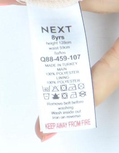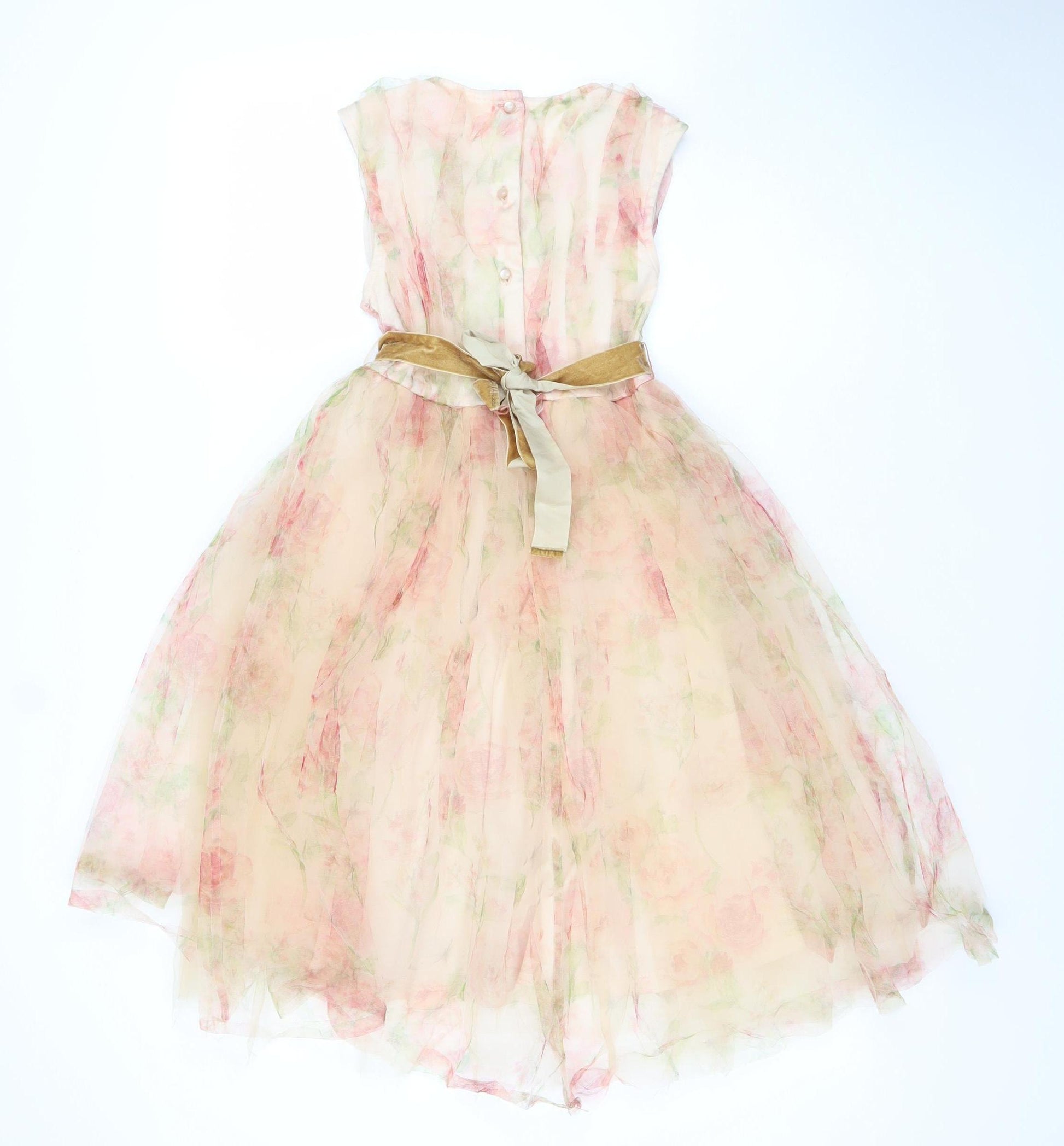 This exquisite Next girls’ dress is perfect for special occasions, with a delicate design that is both elegant and youthful. Crafted from a soft beige organza fabric, it features a beautifully subtle floral print in shades of pink and green that creates a fresh, springtime look. The fit & flare silhouette adds a timeless shape, while the hi-low hem gives it a modern, floaty finish that moves gracefully with every step. A gently rounded neckline and capped sleeves offer a sweet and comfortable fit for any little girl. The waistline is accentuated by a velvety gold ribbon belt which ties into a bow at the back, adding a charming accent that enhances the dress’s overall sophistication. Fully lined for comfort, it ensures a soft feel against the skin while retaining its airy layered look thanks to its sheer tulle overlay. The dress fastens neatly with a zip at the back, making it both easy to wear and secure. Made from 100% polyester, this dress is lightweight and easy to care for, being fully machine washable. The stunning floral design and elegant pastel tones make it ideal for a range of formal or semi-formal occasions, from weddings and parties to family gatherings and photoshoots. Perfectly designed for spring and summer, this dress embodies everything charming about youthful fashion – soft, flowy, and effortlessly pretty.In excellent condition with no visible signs of wear, this Next girls’ dress offers both style and quality at a fantastic value. Finished with layered detailing and a graceful silhouette, it’s a lovely choice for any young girl’s occasion wardrobe – a piece that will be admired and treasured for its delicate beauty and elegance.