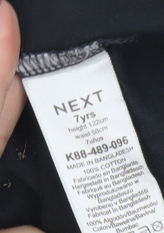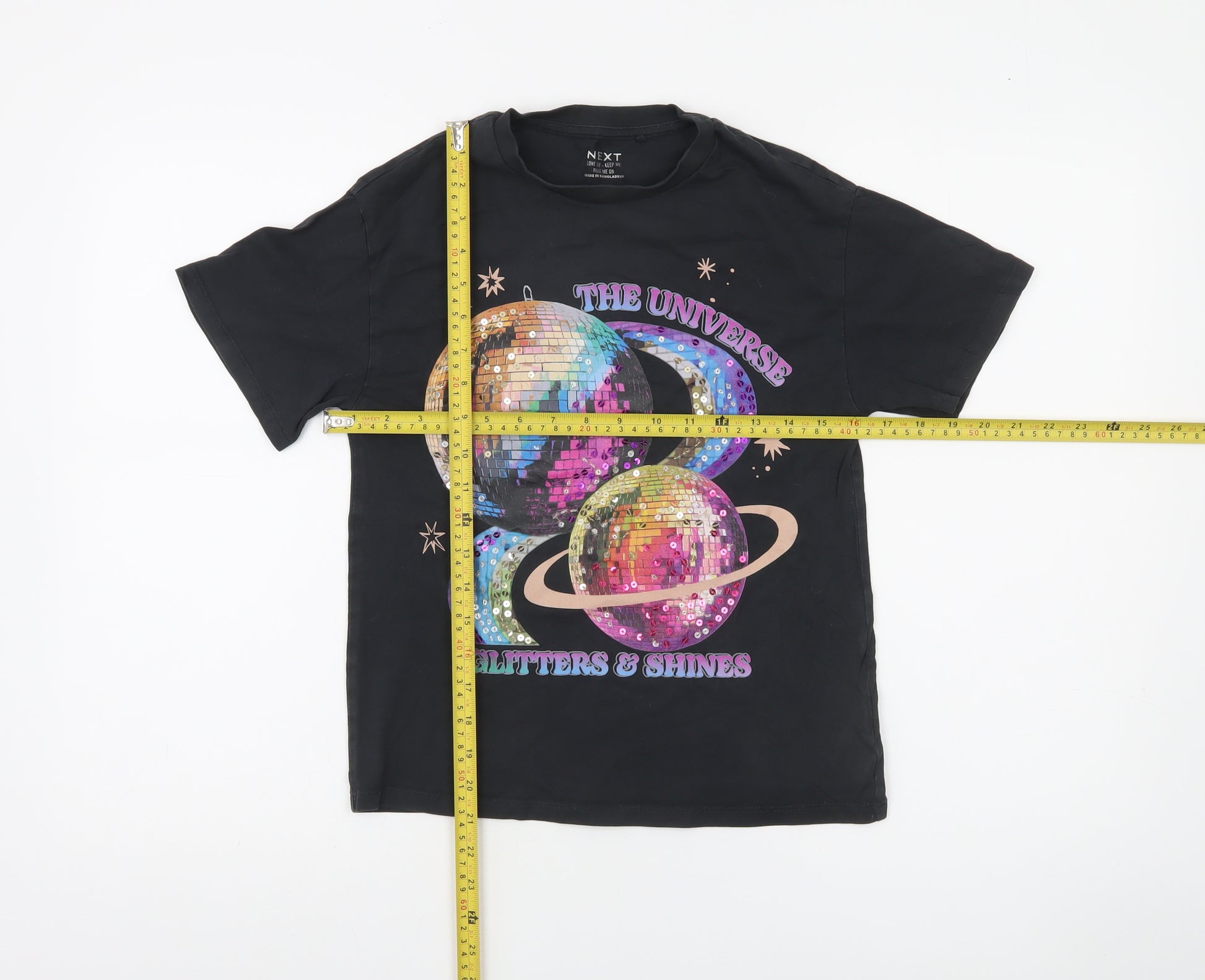 Ignite her imagination with this Next Girls Black Sequin Galaxy T-Shirt, crafted to bring a burst of cosmic fun into any wardrobe. Designed in soft, breathable 100% cotton, this short-sleeve tee offers a comfortable and lightweight fit ideal for active days. The bold black backdrop showcases a dazzling, eye-catching galaxy print with vivid sequined planets that shimmer in every light, elevating this simple T-shirt into something truly special. Perfect for parties, playdates or everyday adventures, it’s styled with a classic crew neckline and a regular fit for easy pairing with jeans, shorts or skirts. The vibrant 'The Universe Glitters & Shines' text gives it an uplifting, creative edge that glows with positive energy. This space-inspired T-shirt merges comfort and expressive style effortlessly, making it perfect for budding explorers who love a touch of sparkle. Made with care from 100% cotton jersey, it ensures all-day comfort and easy garment care — machine washable and ready for repeated wear. Whether it's for casual days, after-school fun, or special themed events, this statement tee adds instant flair. A wonderful choice for spring and summer days and easily layered in cooler autumn weather, this Next piece combines quality craftsmanship and a sense of playful wonder. Condition is rated as Excellent, showing barely any wear and no major flaws. This charming galaxy glitter T-shirt will quickly become a go-to favourite, blending softness, durability and stellar design in one stylish package.