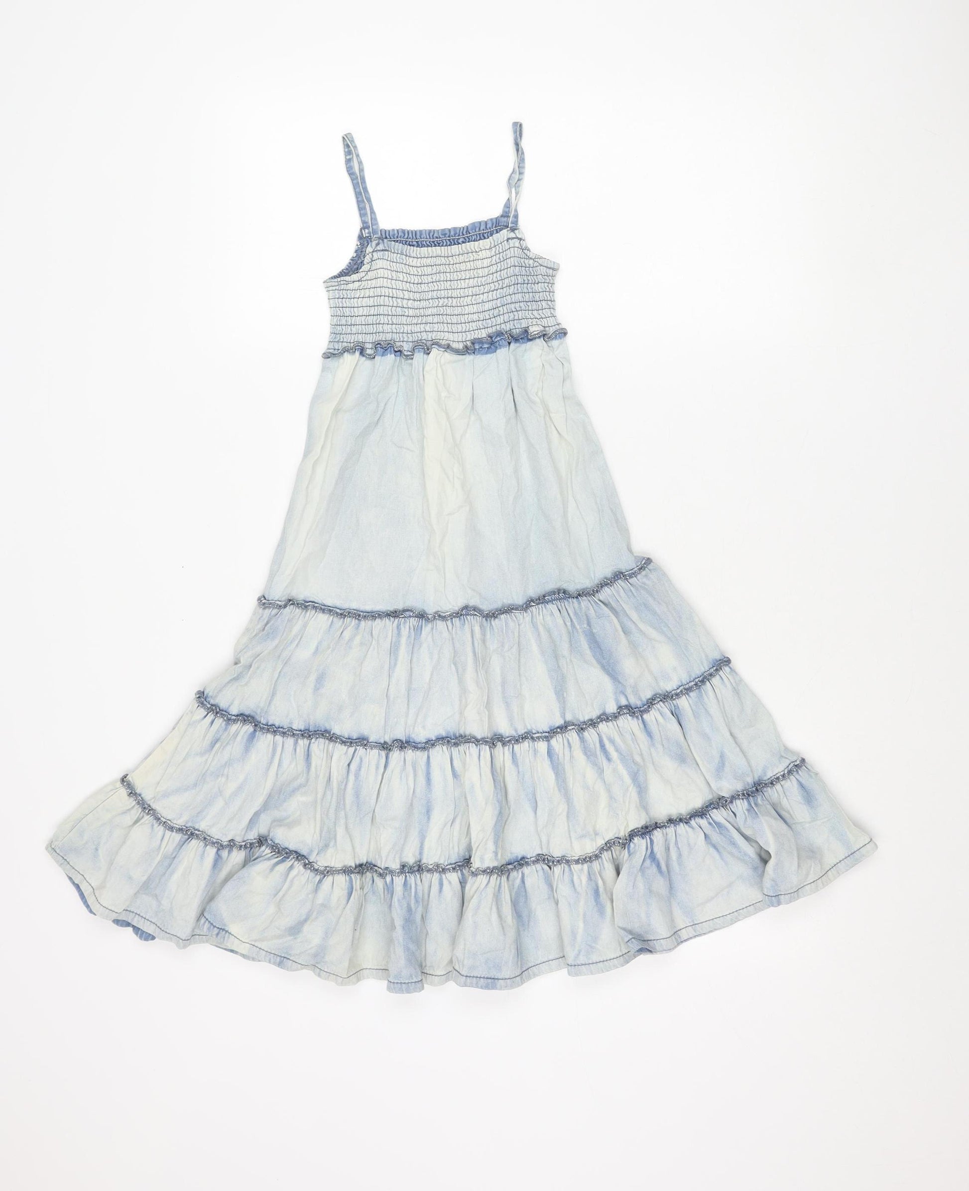 This charming Next girls' dress is a light and breezy choice for her spring and summer wardrobe. Crafted entirely from 100% cotton, it offers a breathable, lightweight feel that keeps her comfortable throughout the day. Designed in a soft blue wash shade, the dress has an effortlessly stylish appeal with a swingy trapeze silhouette and tiered ruffle accents that create a playful, twirl-worthy effect. The smocked bodice provides a stretchy and comfortable fit, while the slender strappy sleeves enhance the summery look. Perfect for warmer weather, this versatile piece works well for casual days, summer parties, holidays, or even a day at the beach. With its pullover design, this dress is easy to wear and fuss-free for active children. The square neckline flatters while maintaining a modest, age-appropriate charm, and the knee length makes it practical for everyday wear. Condition is very good, with no signs of staining, tears, or major wear noted – however, it does not come with its original sales tags. Machine washable for easy care, this cotton dress is both durable and soft. Ideal for families seeking comfort and style combined, it represents excellent value for money. Whether she is playing in the garden, attending a party, or enjoying a family outing, this dress lends itself beautifully to a wide range of occasions. A reliable and fashionable wardrobe staple from Next, it’s a must-have, combining quality, comfort, and effortless charm for any little girl.