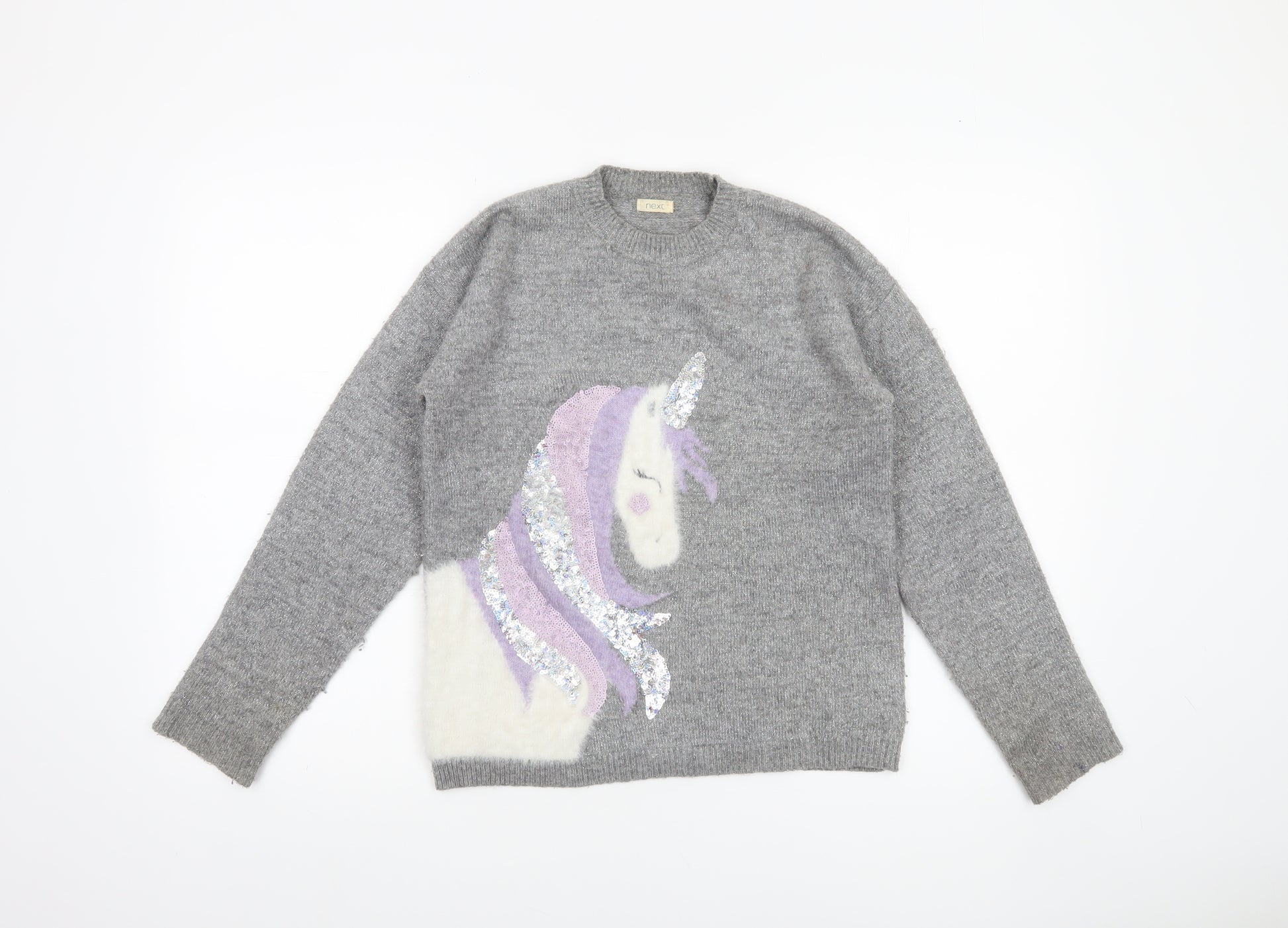 Next Girls Grey Unicorn Sequin Pullover Jumper 11 Years Acrylic Blend