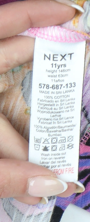 This vibrant multicoloured floral skater dress by Next is a charming and playful piece perfect for girls aged 11 years. Made from 100% cotton, the dress is lightweight and breathable, ensuring ultimate comfort throughout the day. It features a lively floral pattern in bright shades of pink, orange, purple, yellow, and green, making it an eye-catching choice for any occasion. The soft jersey fabric feels gentle on the skin, while the short sleeves and crew neckline provide a relaxed yet stylish fit.The dress has a classic skater silhouette with a defined waistline and knee-length hem, giving it a flattering shape that allows free movement for play and leisure. Its pull-on design ensures ease of wear, ideal for busy mornings or quick outfit changes. The cap sleeves add a touch of feminine charm, while the overall style lends itself to both casual days out and special occasions, such as parties, holidays, or family gatherings. The bright floral motif perfectly captures the fun spirit of spring and summer wardrobes.Designed with practicality as well as style in mind, this Next girls’ dress is machine washable, making it easy for parents to care for. The excellent pre-owned condition indicates the dress has been lightly worn with no visible stains, holes, or damage, though the absence of original retail tags categorises it as used. This means you can enjoy a high-quality, stylish garment from a trusted brand at an affordable price.Whether paired with sandals for a sunny day out, layered with tights and a cardigan for cooler evenings, or styled with trainers for a casual everyday look, this dress adapts beautifully to multiple occasions. The bold floral print ensures it stands out as a cheerful and fun addition to a young girl’s wardrobe. Offering both comfort and style, this Next floral skater dress is a versatile choice that will quickly become a favourite piece for the warmer months. Invest in this quality dress at a fraction of the retail cost for an eye-catching and reliable wardrobe staple.