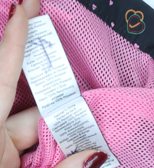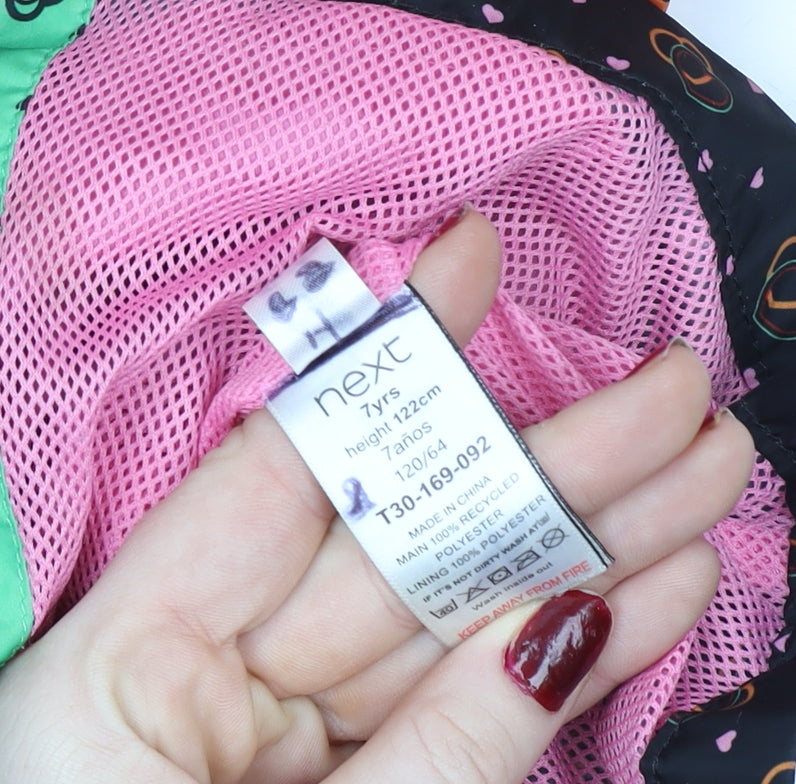 Brighten up any rainy or breezy day with this colourful Next Girls Multicoloured Heart Print Hooded Windbreaker Jacket in size 7 Years. Crafted from 100% polyester, this lightweight coat offers a comfortable and durable layer perfect for Spring or Autumn wear. The jacket features a bold multicoloured patchwork design with pink, green, orange and black panels decorated with playful heart prints, adding a fun and cheerful touch to everyday outfits. Designed with practicality in mind, this windbreaker includes a full zip fastening for easy dressing, an attached hood for additional protection from the elements, and elasticated cuffs for a snug fit that helps keep the wind out. The soft polyester lining ensures comfort throughout use without adding extra bulk, making it ideal for layering over school uniforms or casual weekend looks. Styled in a relaxed regular fit and mid-length cut, it provides just the right amount of coverage while maintaining ease of movement for playtime or outdoor adventures. Whether your child is heading to school, the park, or on holiday, the vibrant colouring and durable build make this jacket a delightful and practical choice for many occasions. Machine washable for easy care, this well-made jacket demonstrates the quality and design you would expect from Next. In excellent pre-owned condition with no visible wear, it’s perfectly suited for a sustainable wardrobe refresh. Its fun aesthetic and lightweight feel will make it a favourite piece for both kids and parents alike, combining playful fashion with everyday functionality. A reliable and eye-catching essential for girls who love colour and comfort, this multicoloured Next hooded jacket will brighten up every outfit and every adventure.
