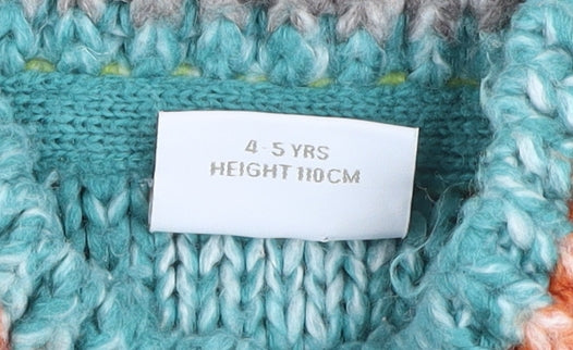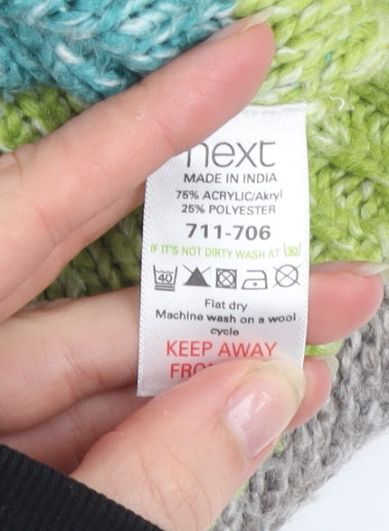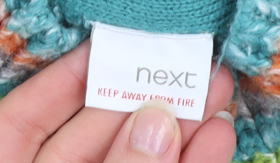 Brighten up your little one's wardrobe with this charming multicoloured striped cardigan from Next. Perfectly sized for girls aged 4-5 years, this playful knitwear piece brings both comfort and cheerful style to cooler days. The cardigan features a mix of bold, fun stripes in shades of turquoise, orange, grey, and lime green, making it a lively choice for any young fashion fan. The chunky knit fabric provides a cosy yet breathable feel, great for layering during autumn, spring or cooler summer evenings. Designed with short sleeves and a comfortable collared neckline, it allows easy movement while adding an adorable touch of detail. The cardigan fastens with four large buttons in complementary colours, adding a playful and eye-catching accent. Crafted in India from soft 75% acrylic and 25% polyester, the knit fabric has a wonderfully soft handfeel and is easy to care for — simply machine wash on a wool cycle and lay flat to dry. Its versatile design makes it an ideal layer over dresses, T-shirts, or long-sleeve tops, perfect for casual everyday wear or family outings. In excellent pre-loved condition, this piece has no visible imperfections and retains its vibrant colours and shape beautifully. Whether paired with leggings, jeans or a skirt, this striking cardigan adds personality and warmth to any outfit. Offering a balance of style, comfort and practicality, it is sure to be a go-to favourite in your child’s wardrobe. Ideal as a thoughtful gift or wardrobe staple, this Next short sleeve cardigan brings together quality craftsmanship and contemporary design at a great value. A lovely example of the brand’s attention to playful yet practical children's fashion.