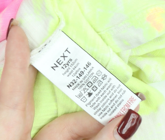 Bright, cheerful and effortlessly stylish, this girls’ multicoloured skater dress from Next is perfect for adding a splash of fun to her spring and summer wardrobe. Crafted from soft and breathable 100% cotton, the dress ensures comfort throughout the day, making it ideal for casual outings, holidays, or parties. The playful tie dye print combines vibrant shades of purple, pink, peach and lime green, bringing a lively, festival-ready feel without being over the top. With its crew neckline and short ruffle-trim sleeves, this piece offers a touch of girly charm while maintaining a relaxed and easy-to-wear silhouette.The skater style gives the dress a flattering flow, designed to fall around knee length for comfortable coverage and all-day wearability. The pullover closure ensures practicality and ease, while the lightweight jersey fabric makes it breathable and great for warmer weather. Subtle ruffle accents on the sleeves lend a delicate finishing detail, perfect for parents seeking both comfort and style in their little one's wardrobe.Sized at 12 years with a chest measurement of 32 inches and waist size of 64 cm, it provides a reliable fit for growing girls. Machine washable for stress-free garment care, the dress is durable and designed to handle the active lifestyle of children without compromising on style. Although pre-loved, it remains in excellent condition with no stains, tears or significant signs of wear.This Next tie dye skater dress combines colour, comfort, and trend-led design, making it a versatile piece suitable for a wide range of occasions—from everyday casual wear to summer garden parties and holidays. Brighten up her wardrobe with this standout statement dress at a great second-hand price, offering fantastic value for money while staying environmentally conscious with sustainable shopping.