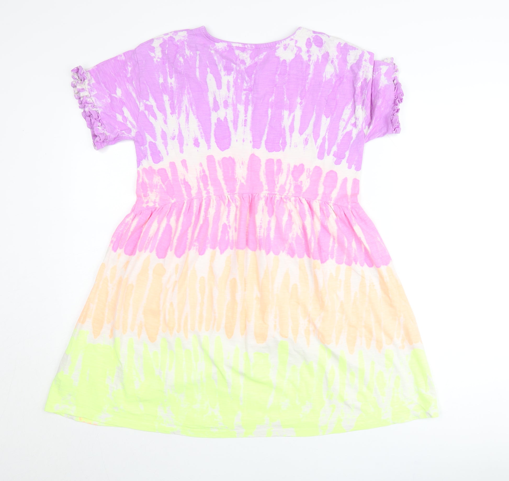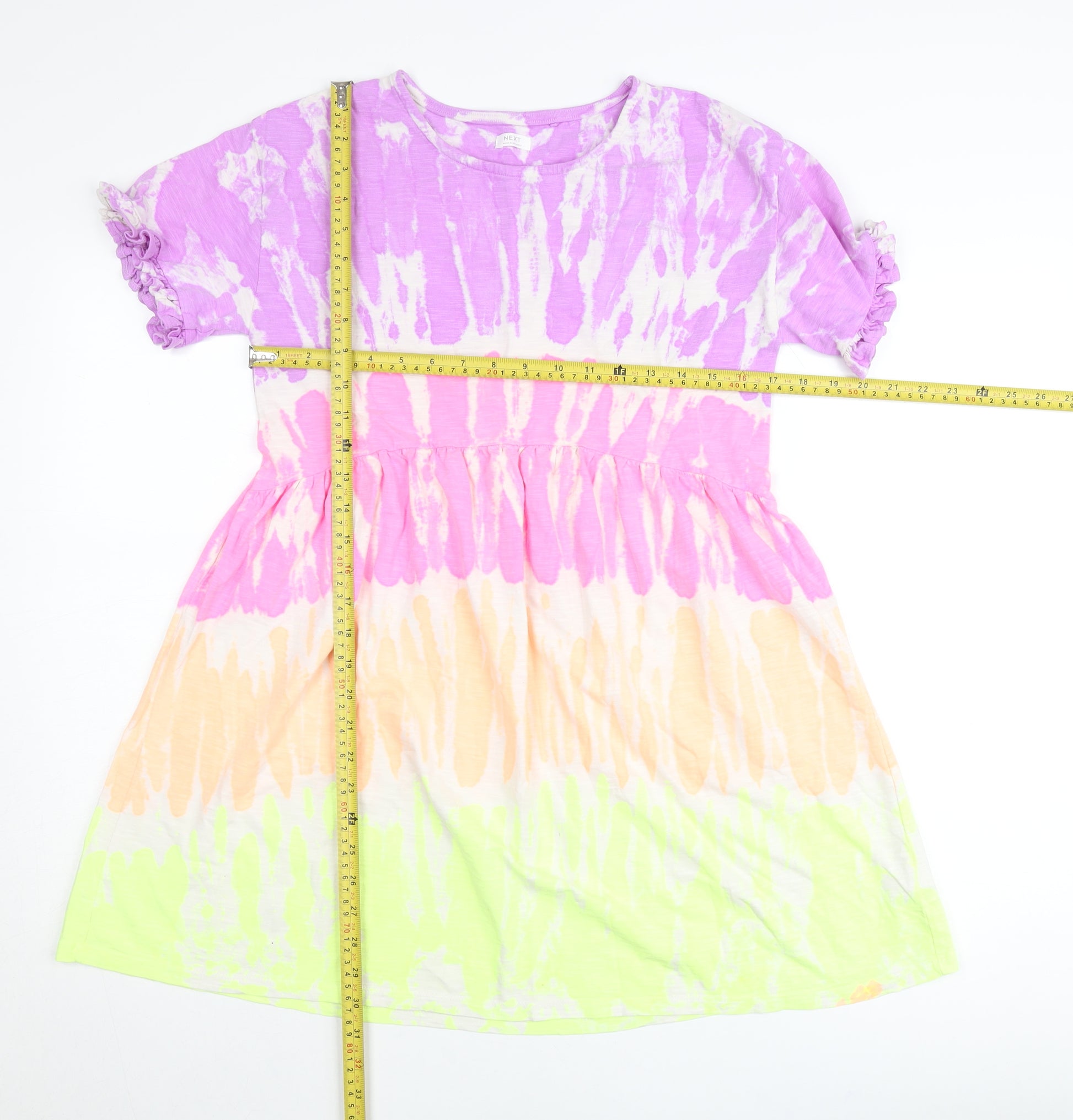 Bright, cheerful and effortlessly stylish, this girls’ multicoloured skater dress from Next is perfect for adding a splash of fun to her spring and summer wardrobe. Crafted from soft and breathable 100% cotton, the dress ensures comfort throughout the day, making it ideal for casual outings, holidays, or parties. The playful tie dye print combines vibrant shades of purple, pink, peach and lime green, bringing a lively, festival-ready feel without being over the top. With its crew neckline and short ruffle-trim sleeves, this piece offers a touch of girly charm while maintaining a relaxed and easy-to-wear silhouette.The skater style gives the dress a flattering flow, designed to fall around knee length for comfortable coverage and all-day wearability. The pullover closure ensures practicality and ease, while the lightweight jersey fabric makes it breathable and great for warmer weather. Subtle ruffle accents on the sleeves lend a delicate finishing detail, perfect for parents seeking both comfort and style in their little one's wardrobe.Sized at 12 years with a chest measurement of 32 inches and waist size of 64 cm, it provides a reliable fit for growing girls. Machine washable for stress-free garment care, the dress is durable and designed to handle the active lifestyle of children without compromising on style. Although pre-loved, it remains in excellent condition with no stains, tears or significant signs of wear.This Next tie dye skater dress combines colour, comfort, and trend-led design, making it a versatile piece suitable for a wide range of occasions—from everyday casual wear to summer garden parties and holidays. Brighten up her wardrobe with this standout statement dress at a great second-hand price, offering fantastic value for money while staying environmentally conscious with sustainable shopping.