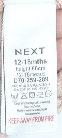 This charming NEXT girls’ babygrow in soft pink is a perfect choice for your little one’s wardrobe, blending both comfort and style. Designed in a cosy knit fabric, this one-piece features a delicate textured pattern throughout, offering a classic and timeless look. Styled with long sleeves and a round neckline, it ensures your baby stays warm and comfortable, particularly throughout the autumn, winter, and spring months. The babygrow is beautifully accented with ruffle details along the shoulders and three adorable bow embellishments at the chest, creating a sweet, feminine touch. Made from a high-quality blend of 60% cotton and 40% acrylic, this outfit provides softness while maintaining durability and easy care. Lightweight enough for layering but warm enough to wear on its own, it is ideal for casual everyday wear or special occasions where your little girl needs to look her best. A button fastening at the back makes dressing and undressing simple, while the all-seasons design ensures this item offers year-round versatility. Machine washable for added convenience, it fits busy parents’ lifestyles perfectly without compromising style.Sized for 12-18 months and designed with comfort in mind, this NEXT babygrow is perfect for playtime, family outings, or cosy days indoors. Its excellent pre-loved condition ensures it still has plenty of life left, with no stains, tears, or visible signs of wear. Though it doesn’t include original sales tags, it remains a wonderful, affordable option compared to buying brand new.Whether you’re searching for a practical day-to-day option or a special outfit for photographs and gatherings, this babygrow offers the perfect solution. Both functional and fashionable, it will quickly become a much-loved piece in any little girl’s wardrobe. Don’t miss this opportunity to pick up a high-quality NEXT garment at a great value.