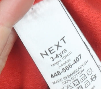 Your little one will look absolutely adorable in this lovely red corduroy shirt dress by Next. Made from 100% cotton, this soft and breathable fabric ensures comfort while maintaining durability for everyday adventures. Designed for girls aged 3–4 years (height 104 cm), the dress features a relaxed fit that allows freedom of movement while keeping the look effortlessly stylish. The knee-length cut pairs beautifully with tights or leggings for cooler weather, making it ideal for both autumn and winter seasons.The charming shirt dress style includes full front button fastening and long puff sleeves with gathered cuffs, adding a touch of volume and playfulness. Two front patch pockets give a practical yet cute touch, perfect for little keepsakes or hands to tuck into when out and about. The round neckline keeps the design simple and minimalist, creating a timeless piece you can easily style for a variety of casual occasions.This unlined, collarless design has all the comfort of cosy corduroy with Next’s well-known quality construction. Ideal for weekend playdates, family outings, or nursery wear, it strikes a perfect balance between cute and practical fashion. The cotton material is easy to care for — simply pop it into the washing machine for a quick refresh.In excellent pre-owned condition, this piece shows minimal signs of wash and wear with no visible marks, tears, or fraying. The original tags are not present, but its condition ensures many more wears ahead. A staple addition to any girl’s wardrobe, this red corduroy dress brings warmth, texture, and cheerful colour to everyday dressing. Pair with a cardigan and boots for a cosy seasonal look that’s effortlessly charming.A durable, comfortable, and stylish choice for your growing girl — perfect for parents seeking both practicality and charm in one fashionable piece.