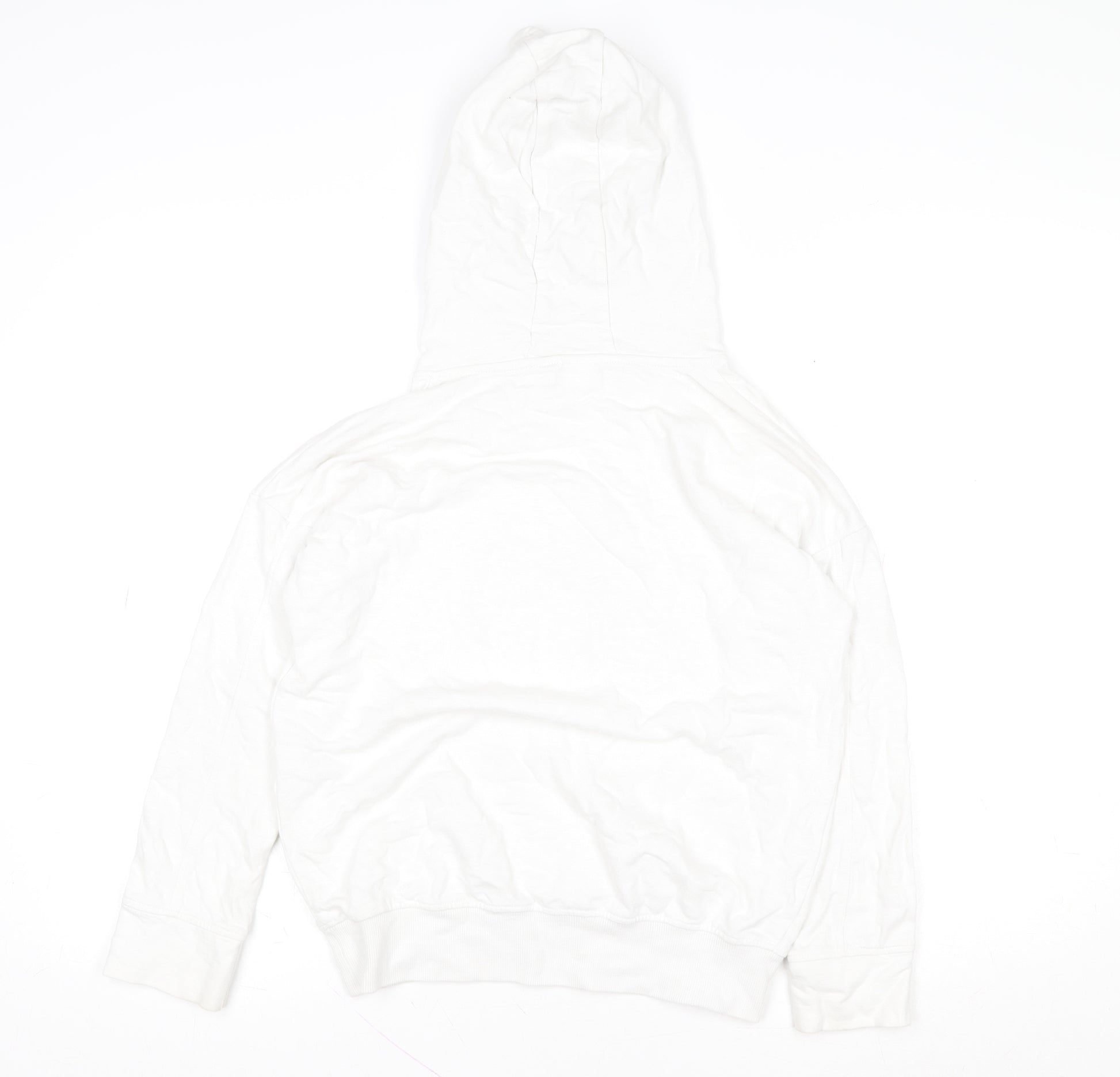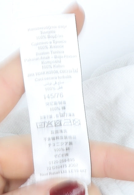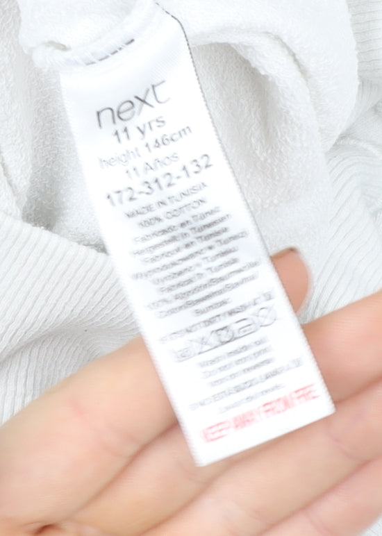 Brighten up her casual wardrobe with this lovely white pineapple print hoodie from Next. Designed especially for girls aged 11 years, this stylish pullover is made from 100% cotton jersey, offering superb softness and lasting comfort against the skin. The lightweight cotton does more than keep her cosy—it’s breathable and ideal for layering across seasons from spring through autumn. Featuring a gleaming gold pineapple graphic on the front, this hoodie adds a playful and trendy touch to any outfit. With its classic pullover design, ribbed cuffs, and hem for an easy fit, it’s a versatile everyday essential she’ll love wearing. Whether paired with jeans for casual days, leggings after dance practice, or short skirts for those sunny outings, this hoodie perfectly balances style and practicality. The attached hood offers a relaxed feel and extra warmth when needed. Machine washable and easy to care for, this hoodie keeps its shape and colour wash after wash. Light and comfortable enough for weekend lounging yet smart enough for outings, it is an ideal choice for any season. In excellent pre-loved condition with minimal signs of wear and no visible flaws, this hoodie has plenty of life left. It’s a great opportunity to give her wardrobe a fun refresh without compromising on quality. Perfect for girls who love something stylish, simple, and cheerful for everyday wear, this white pineapple hoodie captures the laid-back charm of summer in a timeless piece that will become a fast favourite.