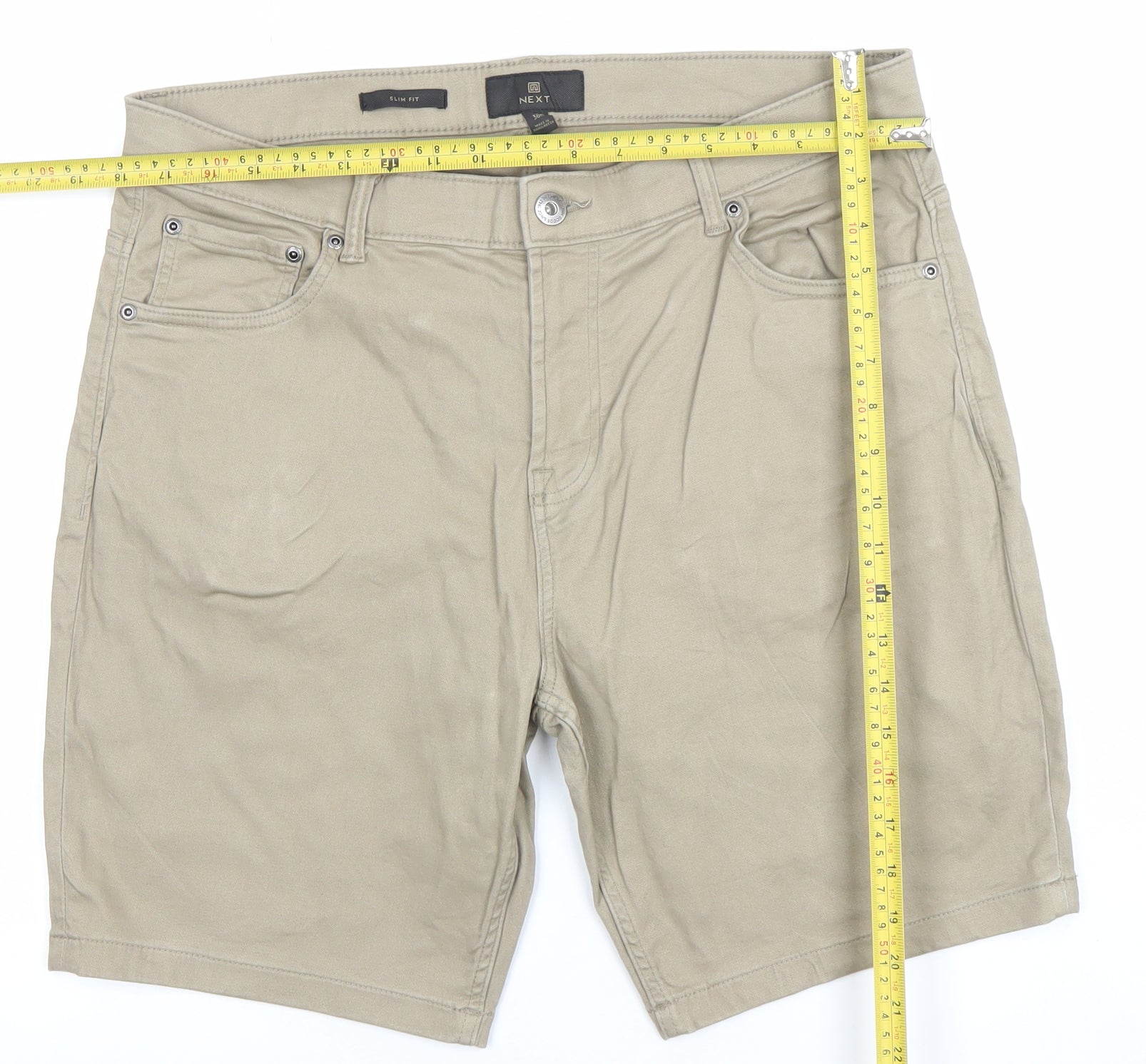 Step into effortless style and comfort with these men’s beige chino shorts from NEXT. Crafted from a high-quality 98% cotton and 2% elastane fabric blend, these shorts offer the perfect balance between breathability and stretch, keeping you comfortable throughout the day. Designed with a sleek slim fit, they flatter the silhouette while retaining an easy, relaxed style suited perfectly for warmer weather. The light beige shade gives these shorts a versatile and timeless appeal, ideal for pairing with polos, shirts, or casual tees – making them a wardrobe staple for spring and summer seasons. Featuring a flat front, classic zip and button fastening, and a practical five-pocket design, these shorts combine modern tailoring with everyday functionality. The durable cotton twill fabric has a soft touch and holds its shape well, ensuring long-lasting wear without sacrificing comfort. These NEXT chino shorts are machine washable for easy maintenance and feature belt loops so you can effortlessly complete your outfit with your favourite leather or canvas belt. Perfect for casual outings, holidays, weekend wear, or even a smart-casual day at work, they are a truly versatile option. The elasticated stretch within the fabric gives you extra comfort for all-day movement, whether you’re strolling along the seafront or heading out for a relaxed lunch. In excellent condition, these pre-owned shorts show no signs of wear beyond light creasing, retaining their crisp appearance and quality feel. With their flattering cut and neutral tone, they’re ideal for matching with a range of colours and styles – a solid essential for the modern man. Add these stylish and comfortable NEXT beige chino shorts to your collection and enjoy a smart yet relaxed look that never goes out of fashion.