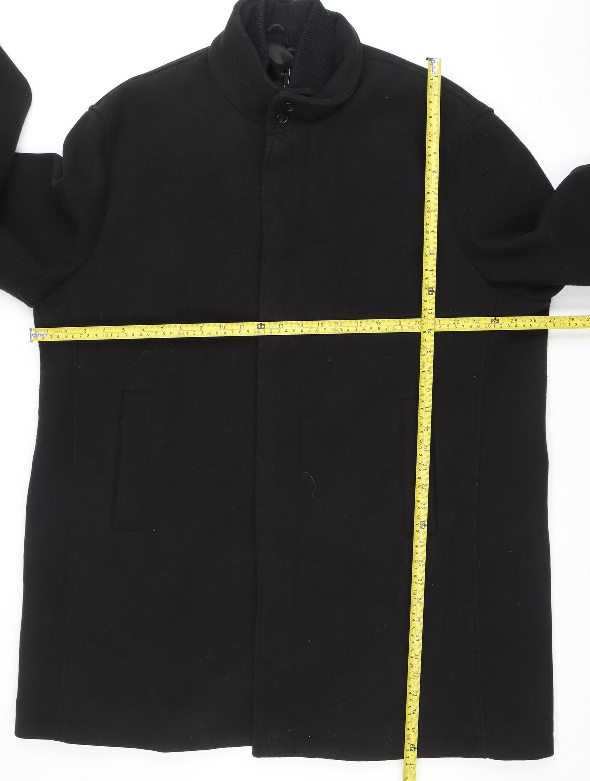 Upgrade your outerwear collection with this sleek and timeless black overcoat from Next Tailoring, crafted for the modern gentleman. Made from a quality blend of 93% polyester and 7% viscose, this coat maintains a refined structure while offering comfortable wear. Designed in a mid-length cut that sits perfectly over business or casual attire, it gives a sharp, sophisticated silhouette suitable for work, evenings out, or formal occasions. The coat features a secure button closure, a structured stand-up collar, and front functional pockets, all combining style with practicality. Its fully lined 100% polyester interior ensures a smooth fit over layers, ideal for insulating against the chill of autumn and winter. Cut in a classic 2XL size with a 48–50 inch chest, it offers a comfortable yet tailored fit that complements a range of builds. Perfect for those seeking both elegance and durability, this Next Tailoring overcoat captures effortless British style. Pair it with tailored trousers and brogues for a gentleman’s formal look or wear over jeans and boots for a refined smart-casual outfit. In excellent pre-owned condition, with only light linting visible on the surface, this coat reflects quality craftsmanship and care. A trustworthy addition to your wardrobe, it’s versatile, practical, and made to keep you warm while maintaining a polished appearance. An excellent choice for daily commutes, business travel, or special occasions—this piece encapsulates classic outerwear done right, ready to elevate your seasonal wardrobe.