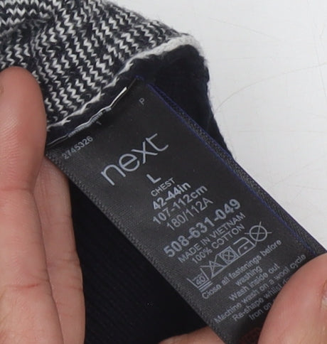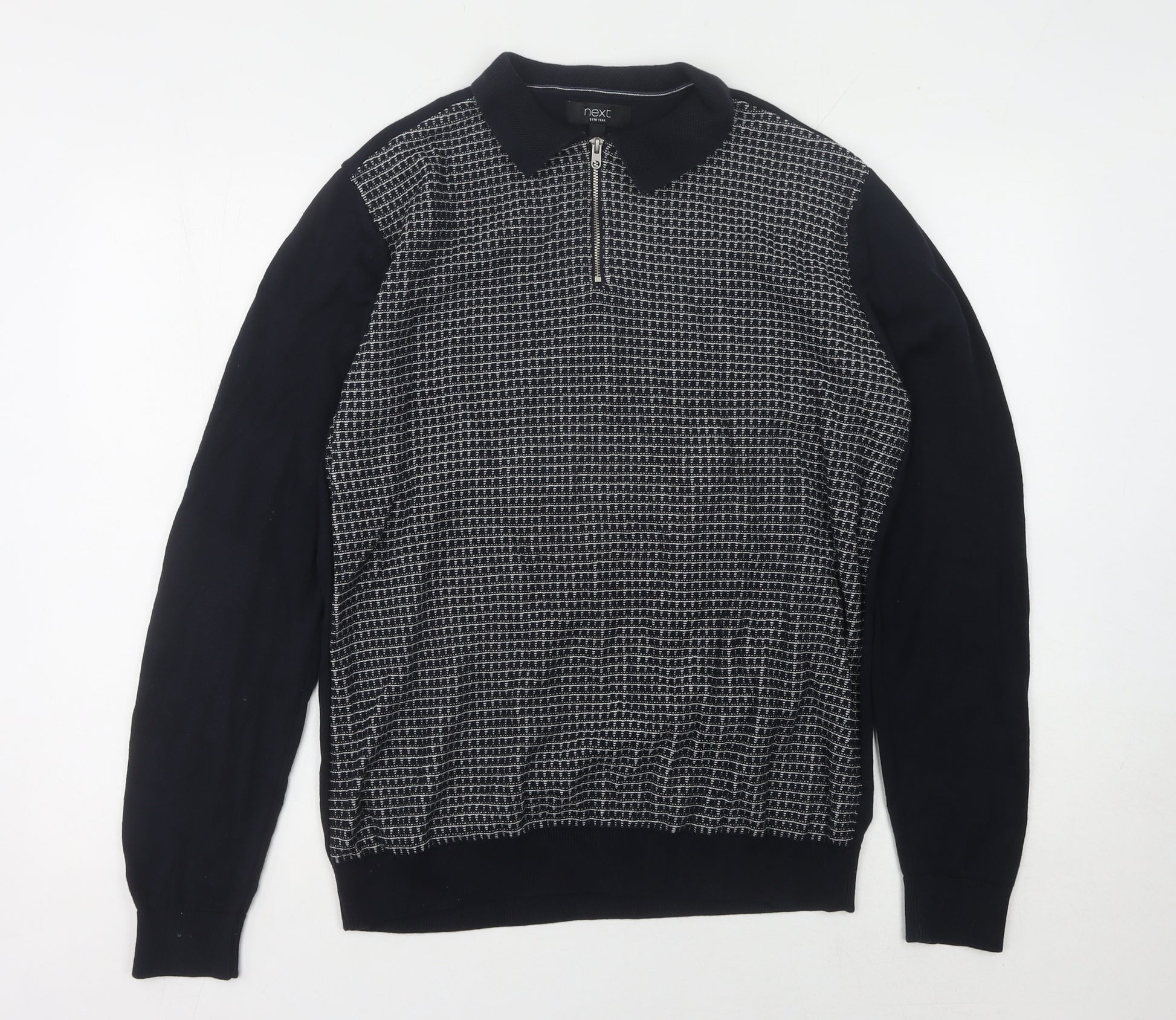 This sophisticated black long sleeve polo is tailored by Next, perfect for men seeking a blend of comfort and style. Crafted from 100% cotton, its breathable knit makes it ideal for those crisp autumn and winter days. The polo features a classic collared neckline and a convenient zip closure, adding a modern twist to its traditional design. Suitable for casual occasions, this polo's regular fit design ensures versatility in styling, whether layered under a jacket for a polished look or worn on its own for a relaxed weekend ensemble. Though slightly used, it remains in excellent condition, free from any noticeable flaws, making it a prudent choice for any wardrobe. Machine washable for easy care, this piece combines both practicality and elegance, promising to become a staple in your autumn and winter attire.