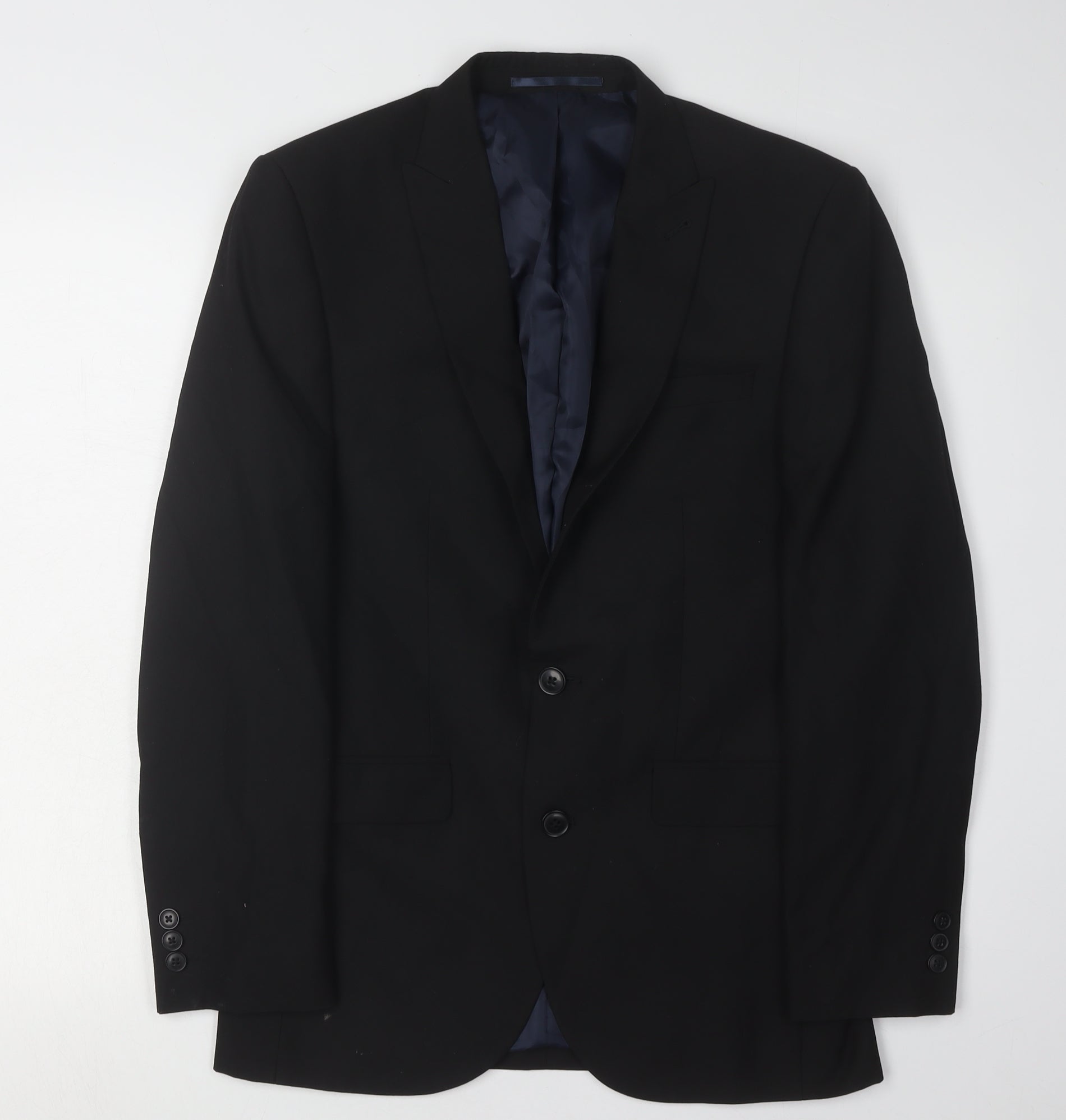 Elevate your professional wardrobe with this sleek men's suit jacket from Next. Expertly tailored for a refined fit, this black suit jacket is an essential item for any business occasion. Crafted from a quality blend of 65% polyester and 35% viscose, it offers both comfort and durability while maintaining a polished appearance. Designed in a single-breasted style, it features a two-button front and notch lapel, exuding a classic yet modern aesthetic.The short length cut is perfect for a tailored look, making it a versatile addition to your wardrobe. The double-vented back ensures ease of movement, while the three-button sleeve adds to its contemporary appeal. Inside pockets provide practicality, allowing you to discreetly carry small essentials. This jacket is lined with 100% polyester for a smooth fit, ensuring that underlayers slide on effortlessly.Ideal for the autumn and winter seasons, this jacket pairs beautifully with both formal trousers and jeans, enabling dynamic styling options. With dry-clean-only care instructions, this suit jacket promises to maintain its first-class look through repeated wears. In excellent condition with no visible signs of wear, it combines style and value seamlessly.Whether you're dressing up for a corporate meeting or adding sophistication to casual gatherings, this Next suit jacket is the perfect piece to complete your ensemble.