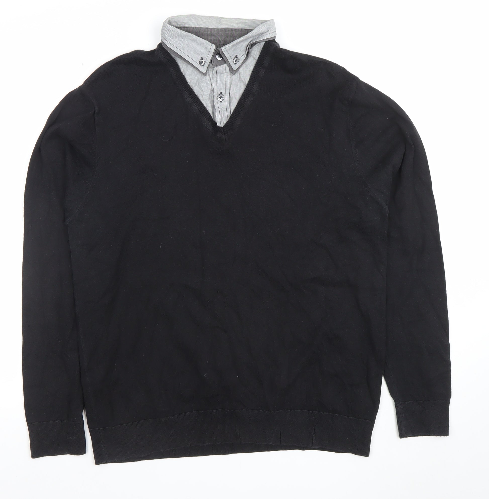 This stylish men's black V-neck polo sweater from Next offers a sophisticated and versatile addition to any wardrobe. Expertly crafted from a soft cotton blend fabric — 80% cotton and 20% nylon — it delivers exceptional comfort while maintaining a smart, structured appearance. The pullover design features a contrasting grey button-down collar that enhances the piece's modern appeal, giving it a layered shirt effect without the added bulk. The long sleeves and ribbed cuffs provide warmth, ideal for cooler seasons such as autumn, winter, and spring, while the breathable knit texture allows versatility across casual and semi-casual settings. Designed in a regular fit, this large-sized piece offers a relaxed yet polished silhouette, ensuring it can be effortlessly paired with jeans for a laid-back look or chinos for an understated smart-casual outfit. Practical features include its easy-care, machine-washable fabric and naturally stretchable knit, which gives freedom of movement and long-term wear comfort. The sweater is lightweight enough for indoor use yet substantial enough for layered outdoor wear. With classic solid black colouring, it brings timeless sophistication to everyday dressing, making it a wardrobe essential for any gentleman seeking comfortable elegance. The item is in very good used condition, showing only light signs of wear and minor creasing that do not detract from its overall quality. Whether for casual outings, office wear, or a relaxed social setting, this Next black V-neck polo sweater strikes the perfect balance between practicality and refined style. Grab it today for a wardrobe staple that defines comfort and effortless sophistication.
