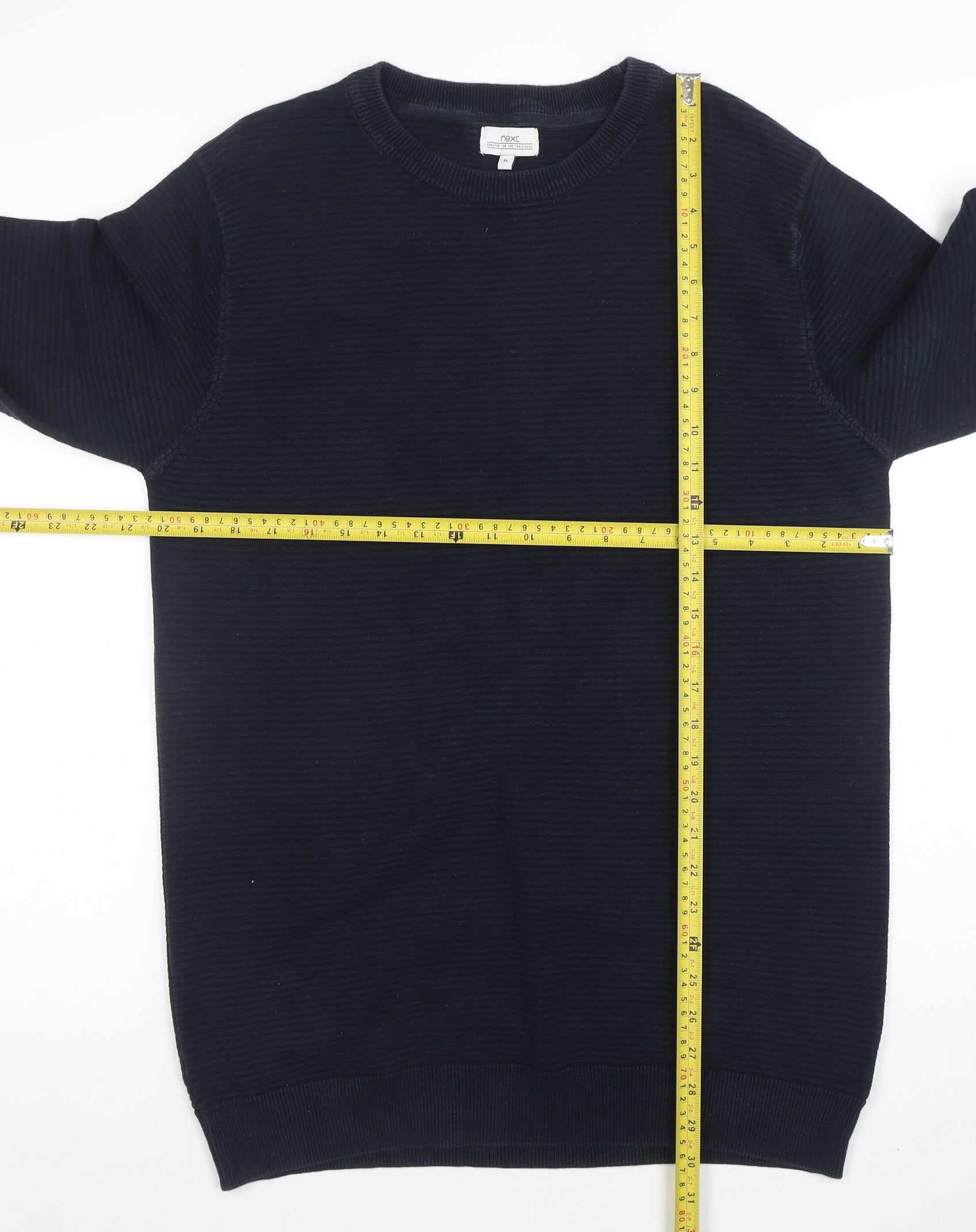 Upgrade your casual wardrobe with this stylish Men's Blue Cotton Jumper from Next. Crafted from 100% cotton, this pullover offers a soft, breathable feel ideal for layering throughout the cooler months or wearing alone for relaxed comfort. The ribbed knit construction adds subtle texture, complemented by the timeless crew neckline and stretch-finished cuffs and hem that ensure an excellent fit. Designed in a versatile navy blue shade, this jumper pairs beautifully with jeans, chinos or smart trousers for both weekend and workwear looks. Made from pure cotton, it provides natural breathability and lasting comfort, making it suitable for Autumn, Spring and Winter use. The material is easy to care for, being fully machine washable. The lightweight knit design gives it a regular fit that drapes neatly without looking bulky, offering a flattering silhouette for everyday wear. Whether heading out for a casual lunch or dressing smartly for a relaxed office environment, this jumper is a perfect addition to the modern man’s collection.In excellent condition with light signs of wear, this piece has been carefully checked to ensure quality and longevity. Ideal for those who appreciate refined simplicity and comfort, this Next cotton jumper delivers understated style at great value. Add a reliable essential to your wardrobe that balances practicality, comfort, and classic British design.