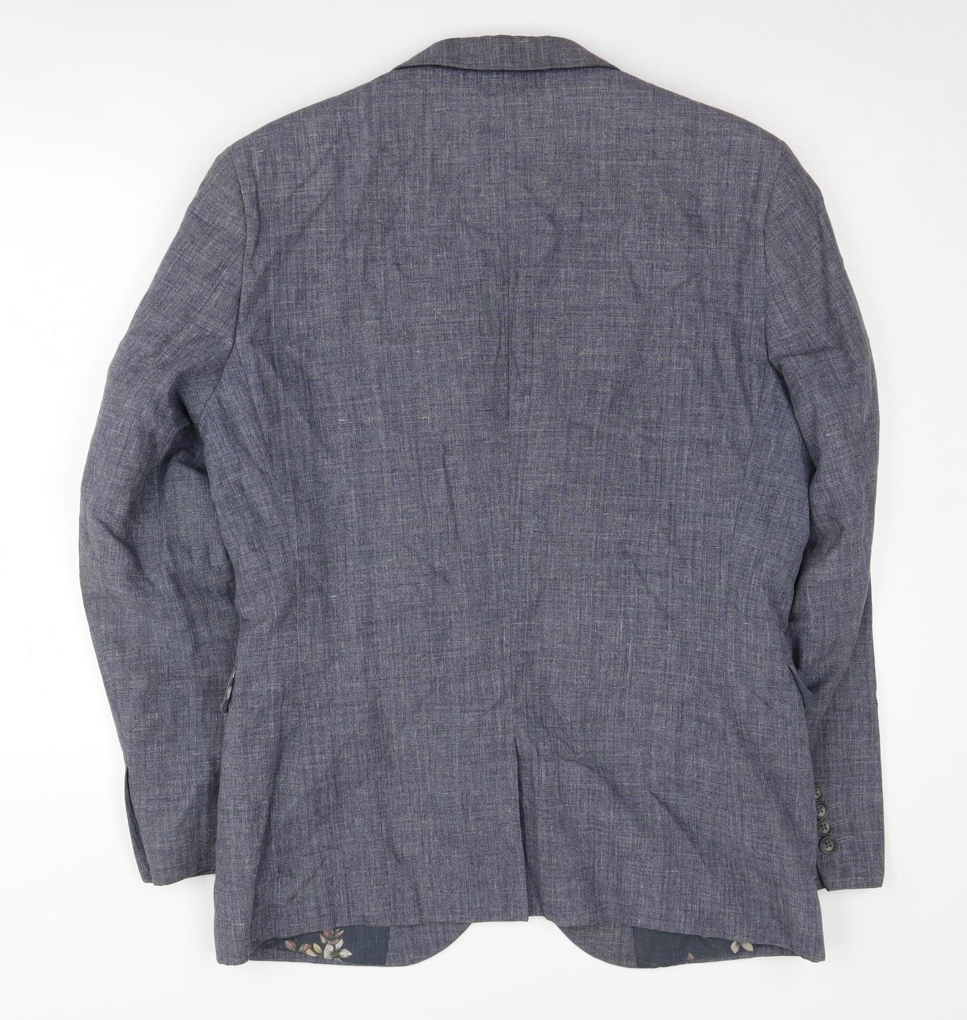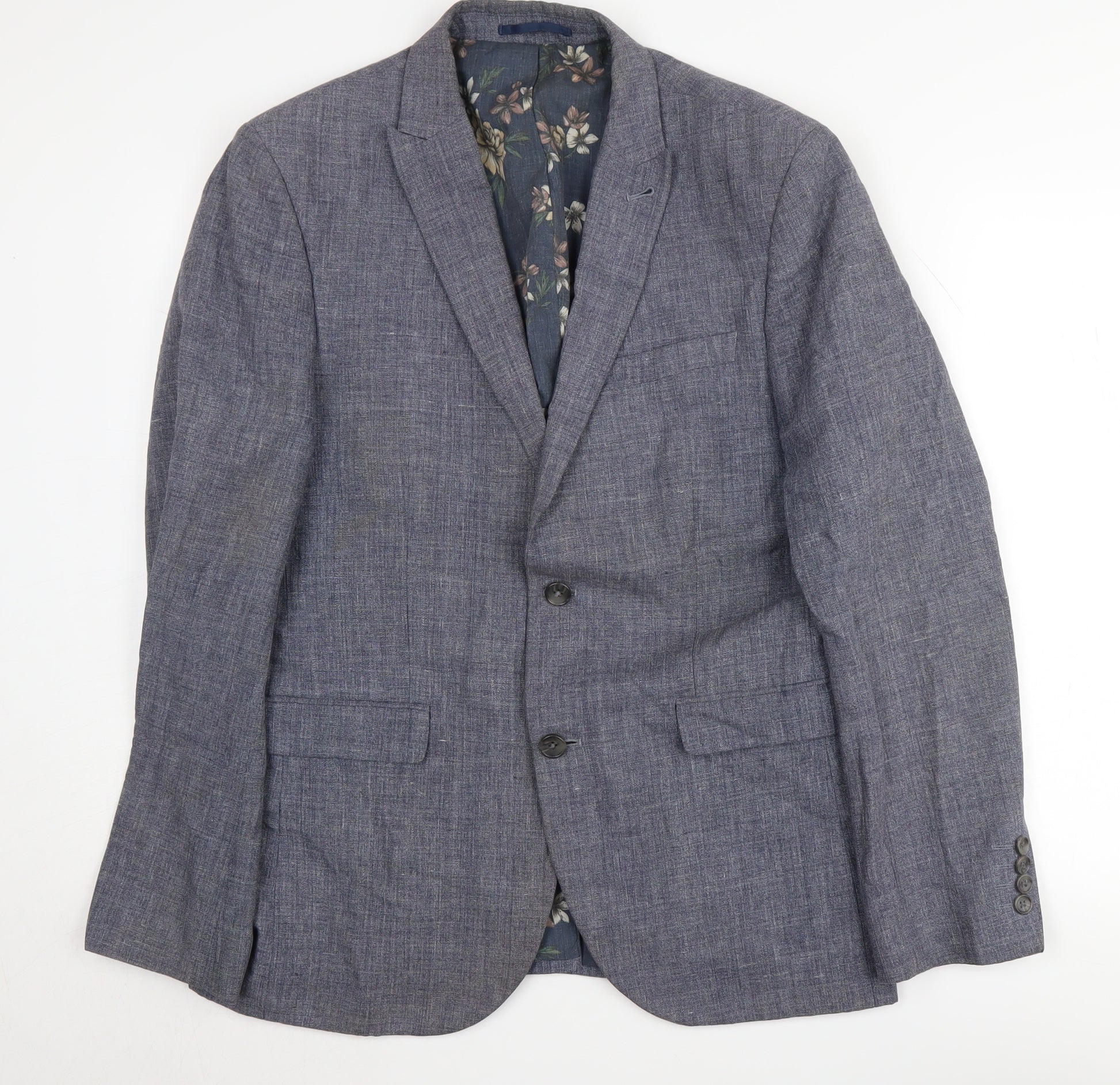This elegant men's blazer from Next is the perfect addition to any gentleman's wardrobe. Crafted for a regular fit, it features a refined single-breasted design with a classic notch lapel, delivering a timeless style suitable for various occasions. The blazer is made from a durable and breathable blend of 50% cotton and 50% linen, ensuring comfort and a sleek appearance. The rich blue colour pairs wonderfully with a variety of shirts and trousers, making it a versatile piece for your formal attire. Designed for comfort and style, it comes with a floral-patterned lining crafted from a mix of polyester and cotton, adding a subtle yet sophisticated touch. The jacket features a two-button front closure, four-button cuff detail, and double-vented back for ease of movement. It is perfect for autumn and spring occasions, whether you're attending a formal event or a business meeting. Condition is excellent with no visible signs of wear, offering a like-new feel. Ensure you look your best by dry cleaning this garment. Elevate your style with this Next blazer, an essential for any fashion-conscious individual who values quality and design.