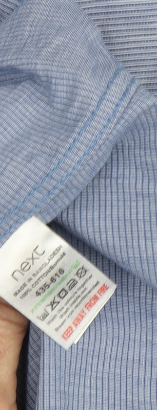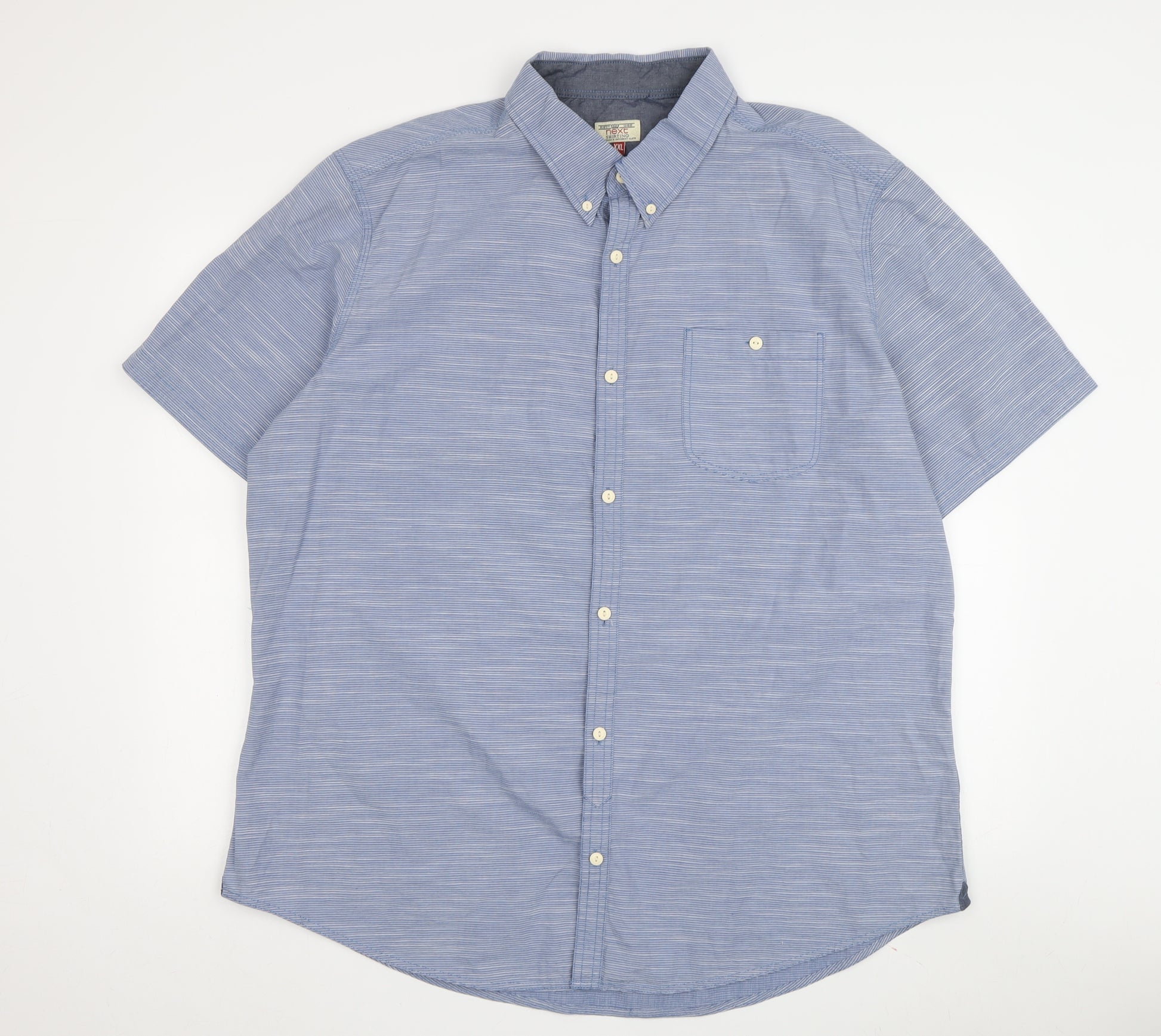 Refresh your casual wardrobe with this classic blue striped shirt from Next. Designed for men, it boasts a timeless button-down collar and is crafted from 100% cotton, ensuring comfort and breathability. The short sleeves and button-up style make it perfect for spring and summer occasions, whether you're out for a casual day or a relaxed evening with friends. Its regular 2XL fit allows for ample room and ease of movement, making it a versatile addition to any wardrobe. In excellent condition, this shirt promises style and durability. Don't miss out on this wardrobe staple that's ready to elevate your everyday look.