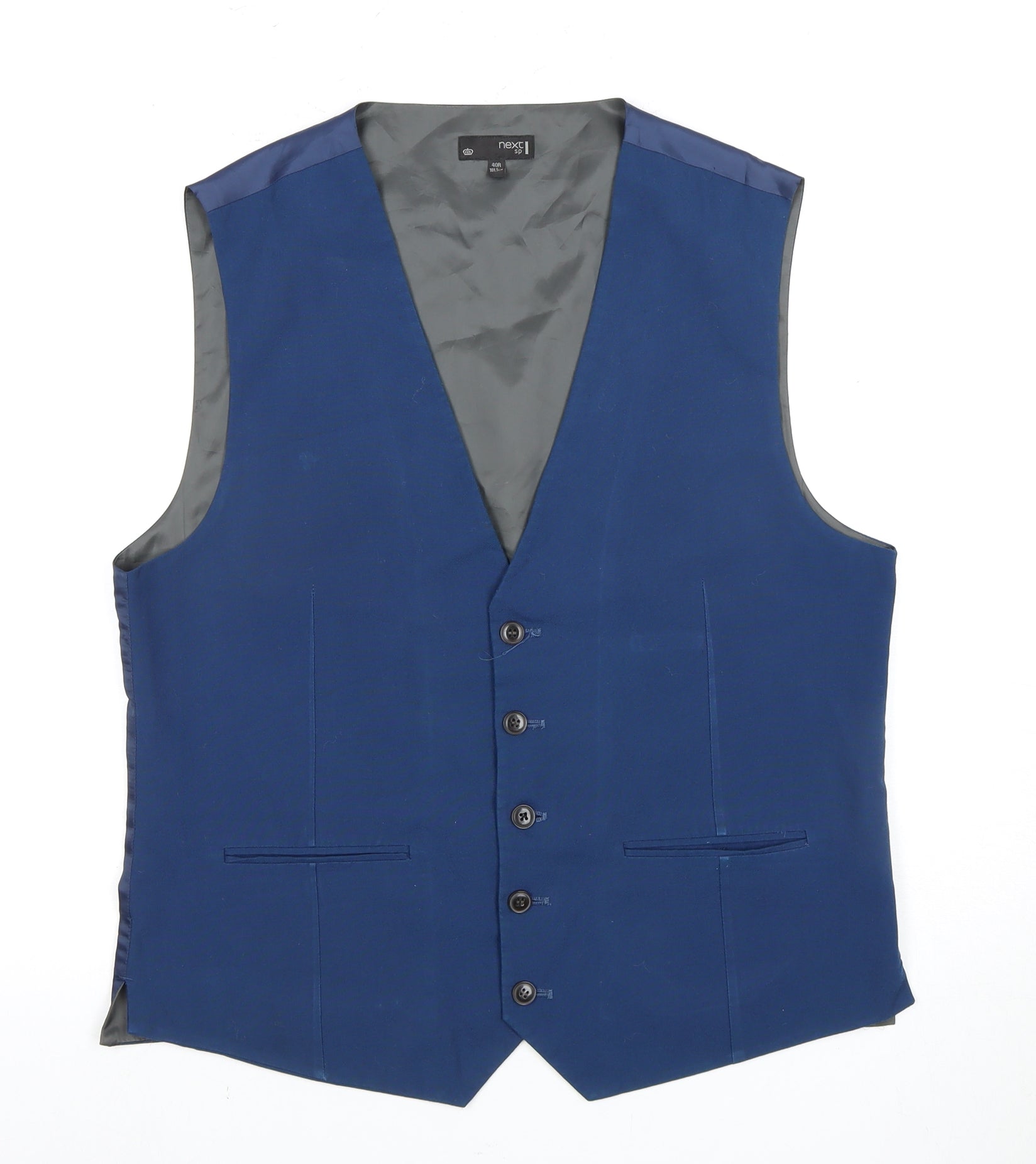 Elevate your formal wardrobe with this sleek and stylish waistcoat from Next. Designed for men, this waistcoat comes in a sophisticated blue tone that effortlessly complements a wide range of styles and colours. Crafted with meticulous attention to detail, it provides a classic and versatile look for any formal event or occasion.Featuring a well-defined shape and adjustable back, this waistcoat ensures a perfect fit and enhanced comfort. It is made from a high-quality blend of 65% polyester and 35% viscose, providing durability and a smooth, luxurious feel. The polyester lining adds an extra layer of comfort, making it an ideal piece for long hours of wear.The waistcoat boasts a no-pattern design, adding to its timeless appeal, and offers a regular length that suits most body types. Perfect for weddings, business meetings, or formal events, this waistcoat pairs beautifully with a matching blazer or can be worn alone over a smart shirt for a more relaxed yet refined look.Whether you're out on a formal dinner or attending a business conference, this waistcoat is your go-to option for making a lasting impression. Its excellent condition and high-quality fabric ensure it retains its charm for years to come. Don't miss the opportunity to add this essential piece to your collection.
