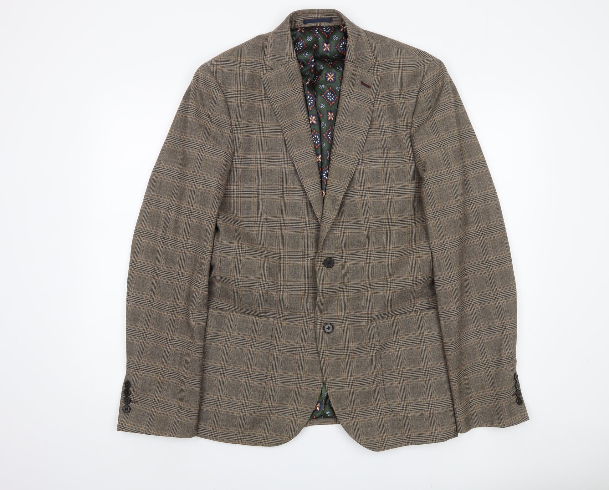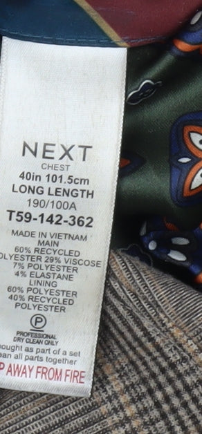 Upgrade your wardrobe with this sophisticated brown check blazer from Next, perfect for business or formal occasions. Crafted with precision, this blazer is tailored to a size 40, offering a classic and elegant fit. The single-breasted design with notch lapels ensures a timeless style, while the two-button front adds a touch of modern sophistication. Featuring a stylish check pattern, this jacket combines fashion with functionality. Made from a high-quality blend of 60% polyester, 29% viscose, 7% polyester, and 4% elastane, it offers both durability and comfort. The lining is crafted from a 60% polyester, 40% recycled polyester blend, adding an element of environmental responsibility to your ensemble. Designed for comfort and style, its double-vented back allows for ease of movement, while the long length adds to its contemporary look. Whether for the office or a formal event, this blazer ensures you always make a powerful impression. With its warm tones and comfortable fit, it's ideal for the autumn and winter seasons. Brand new with tags, this Next blazer is a timeless addition to any gentleman's collection. Dry clean only to maintain its pristine condition. Secure this stylish piece for as low as £70.25, and redefine your formal wear with this elegant and versatile blazer.