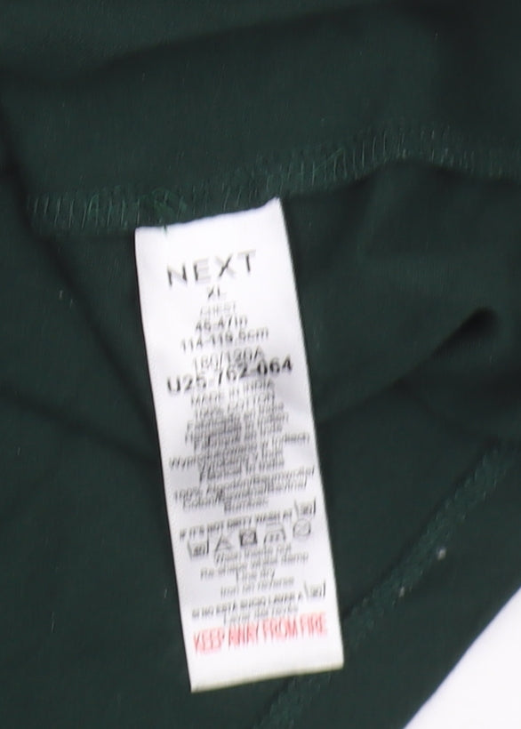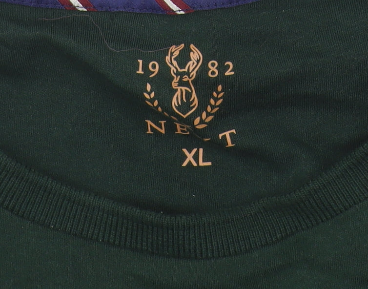 Upgrade your wardrobe with this stylish Next Men's T-Shirt, perfect for adding a touch of sophistication to your casual attire. Crafted from 100% cotton, this green crew neck T-shirt features a classic argyle pattern, elevating it beyond your typical tee. The short sleeves make it ideal for layering or wearing on its own in warmer weather. Its comfortable jersey fabric ensures a soft feel with every wear. The XL size offers a relaxed fit, making it suitable for a variety of body types. Accentuated by a subtle logo, this piece is versatile enough for both laid-back weekends and casual outings. Machine washable for easy care, this T-shirt is an essential for any man's collection. Don't miss out on adding this high-quality piece to your everyday rotation.