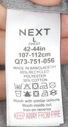 This Next men’s grey formal dress shirt delivers a timeless and versatile look ideal for business or smart-casual occasions. Crafted from a comfortable blend of 65% recycled polyester and 35% cotton, the fabric is soft yet durable, offering excellent breathability and an easy-care finish for everyday wear. With a smooth woven texture and solid grey colourway, it creates a polished impression suitable for the office, client meetings, or evening events alike.Designed with a button-down collar and full button closure, the shirt maintains a classic aesthetic that pairs effortlessly with suits, chinos, or jeans. The long sleeves with barrel cuffs ensure a sharp, tailored look, while the chest pocket with a subtle logo accent adds understated detail. Its regular fit provides balanced comfort, allowing ease of movement without compromising style. The shirt’s lightweight composition also makes it suitable for year-round wear, adapting well under a blazer in winter or worn alone in warmer months.Expertly made in Bangladesh under the trusted Next label, this shirt reflects both quality construction and sustainability through the inclusion of recycled fibres. The easy-care fabric allows convenient machine washing, helping maintain its crisp appearance with minimal effort. With a chest measurement of approximately 42–44 inches (107–112 cm) marked as size L, it’s ideal for most medium-to-large builds seeking smart simplicity. Condition is excellent, showing only light creasing from storage and minimal signs of prior use.A sophisticated choice for professionals and style-conscious individuals, this grey button-down dress shirt is a wardrobe staple that merges comfort, elegance, and practicality. Whether worn with a tie for formal wear or open-collared for relaxed refinement, it’s a truly versatile piece for the discerning gentleman.
