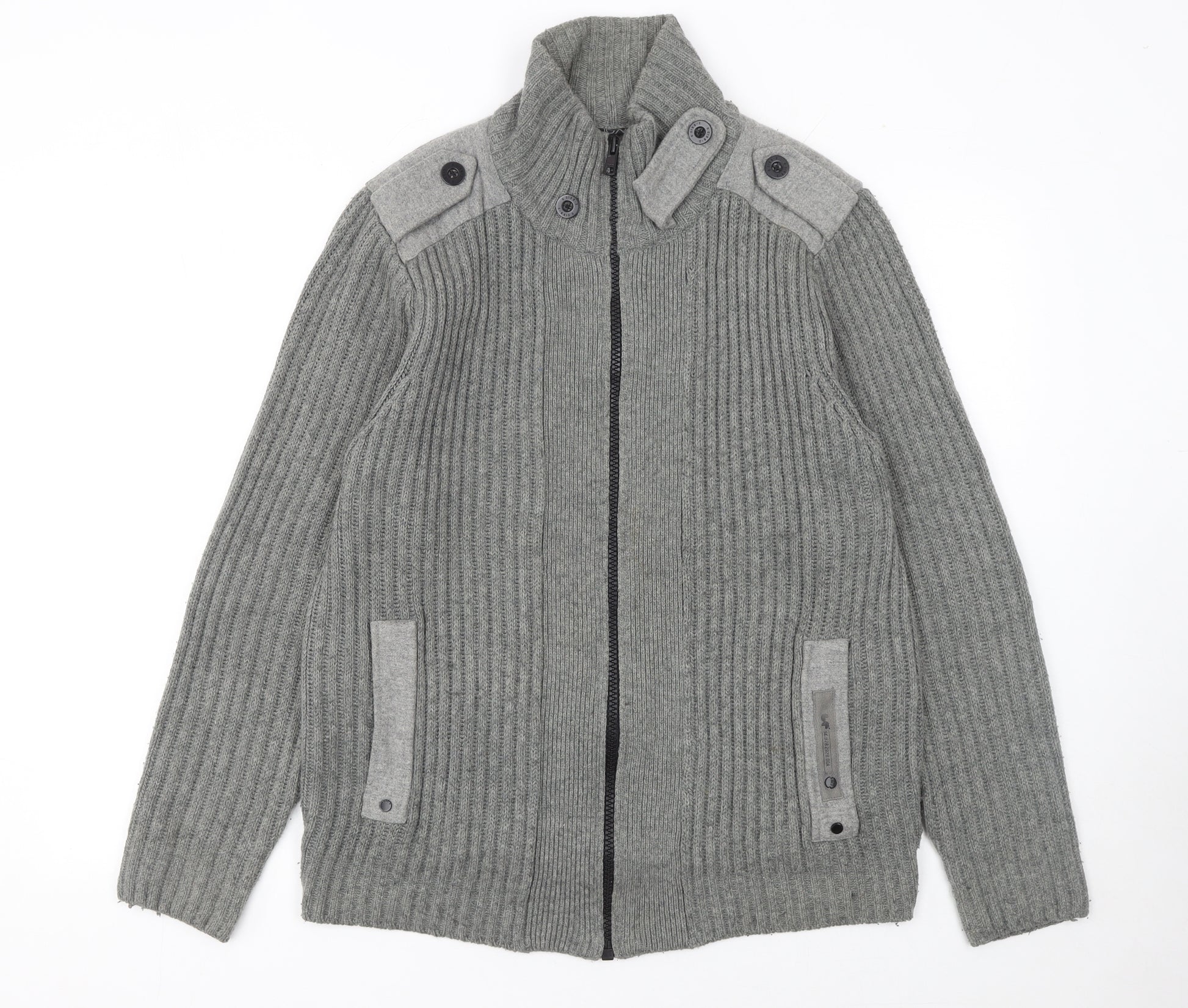 Stay effortlessly stylish and warm with this men's grey full zip jumper from Next. Crafted from a soft blend of 85% acrylic and 15% wool, the knit structure offers reliable comfort and durability, making it a versatile piece for colder seasons. Featuring a chunky-knit design with a high neck and button-tab accents on the shoulders, this jumper combines modern military-inspired detailing with timeless winter essentials. The full zip front adds practicality for easy layering, while reinforced pockets provide both functionality and subtle style. Perfect for weekend wear or relaxed evenings out, the ribbed texture gives it shape and warmth, ensuring a cosy fit throughout autumn and winter. The regular fit silhouette sits comfortably on the body without feeling too tight, suitable for layering over shirts or tees. This versatile neutral grey tone pairs effortlessly with jeans, chinos or casual trousers, allowing for a wide range of style options from laid-back afternoons to smart-casual gatherings. Designed for men who appreciate good craftsmanship and understated fashion, this jumper balances comfort, durability and effortless appeal. Although gently used, it remains in very good condition with only a minor mark near the pocket that does not detract from its look or wearability. Ideal for everyday use, commutes, or outdoor strolls, its full zip closure helps regulate warmth, while the high neck protects against chilly winds. For anyone seeking a practical yet fashionable knitwear piece, this Next full zip jumper is a wardrobe staple that offers style, warmth and quality in equal measure—a perfect choice for transitioning through the cooler months while staying smart and comfortable.
