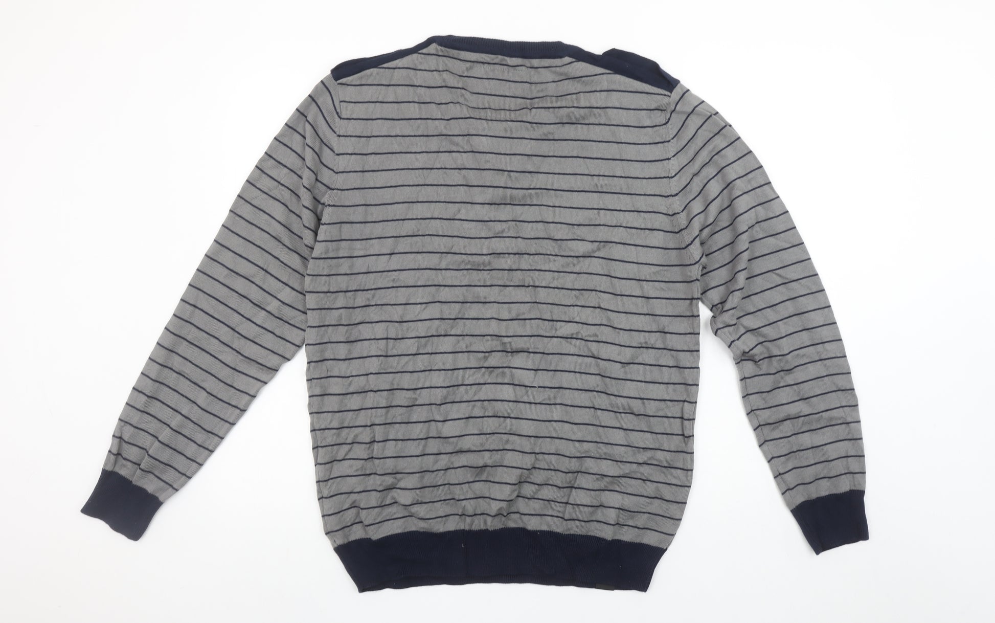 Next Men's Grey Striped Henley Cotton Jumper Size L Long Sleeve
