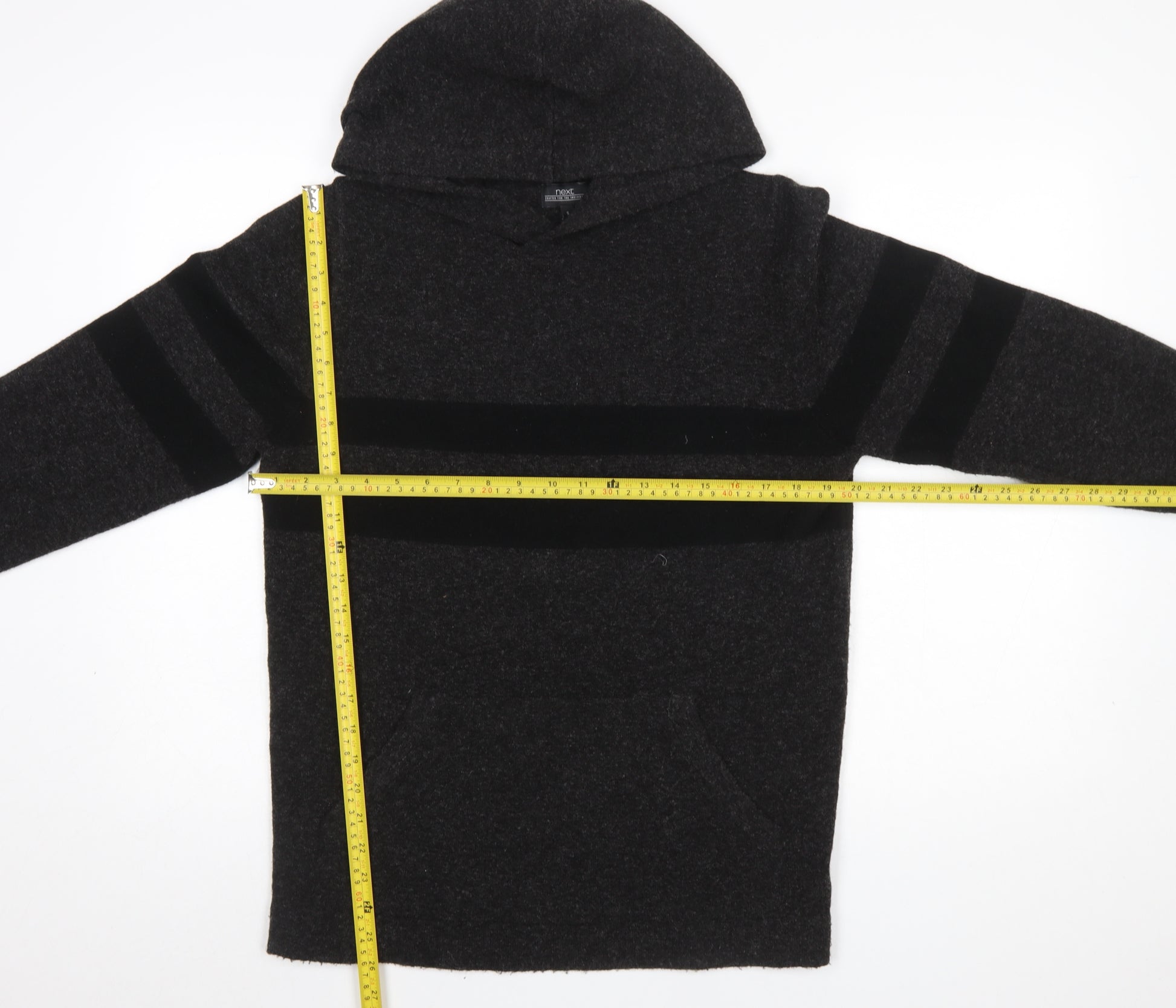 This stylish men's grey hooded jumper from Next is a must-have addition to your casual wardrobe. Crafted from a comfortable blend of acrylic, nylon, wool, and elastane, the jumper provides warmth and durability without feeling too heavy, making it perfect for cooler autumn and winter days. Featuring black horizontal stripes across the chest and sleeves, it offers a modern, sporty look that pairs effortlessly with jeans or casual trousers for everyday wear. The soft knit texture feels gentle on the skin while the regular fit allows just the right amount of comfort for layering over a T-shirt or under a jacket. The V-neck hood design adds a relaxed, contemporary edge and the front pocket provides extra practicality and style. Designed for men who appreciate quality and comfort, this pullover is both functional and fashionable, ideal for travel, weekend outings, or laid-back evenings at home. Machine washable for easy care, this jumper maintains its shape and colour with proper washing. Although pre-owned, it remains in excellent condition with no visible marks or damage, ready to bring warmth and style to its new owner. Update your winter essentials with this versatile piece that blends texture, comfort, and timeless style. A great choice for those seeking a high street brand jumper that offers both simplicity and sophistication. Make it your go-to for effortless everyday dressing, keeping you cosy while looking on-trend.