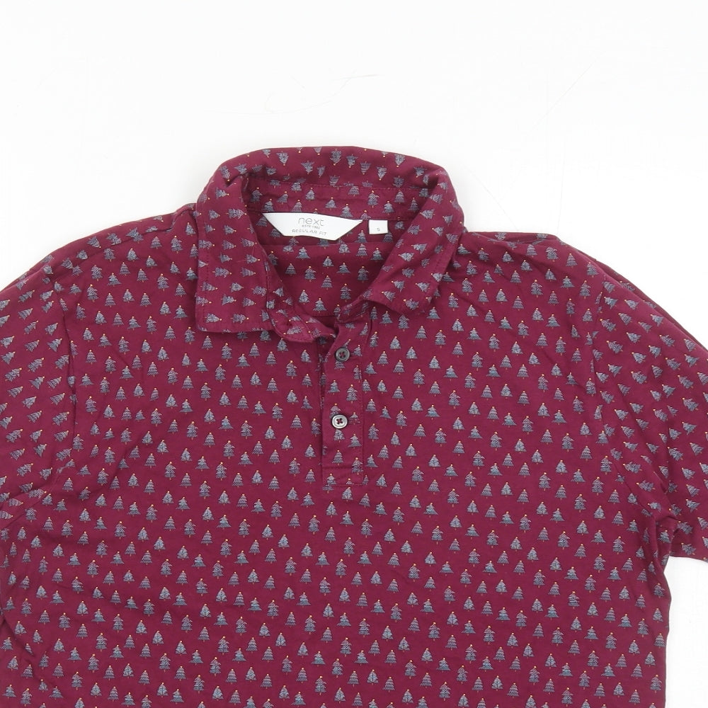 Mens Red Geometric Cotton Polo Size S Collared Button - Christmas Tree